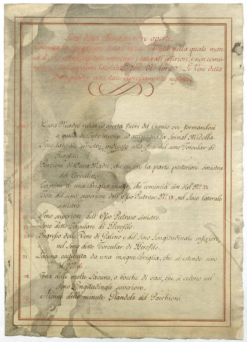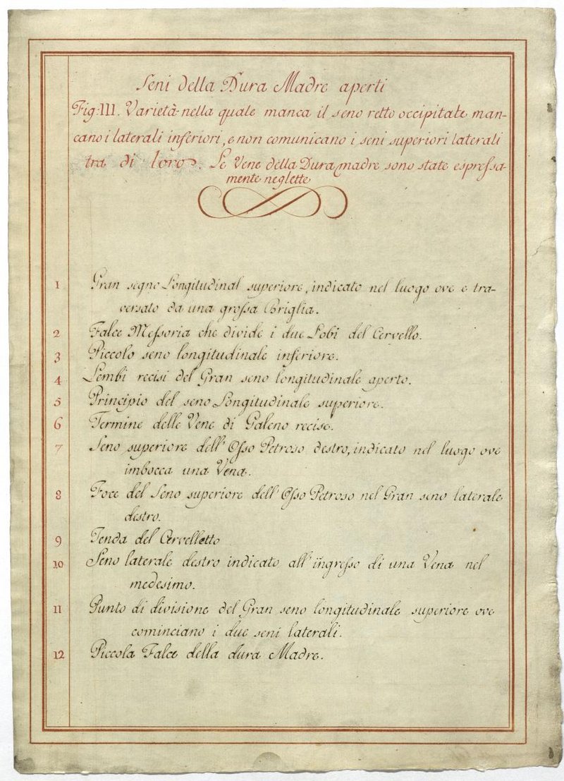 Der Text ist die ergänzende Beschreibung in italienischer Sprache zum anatomischen Wachsmodell der Hirnvenen.