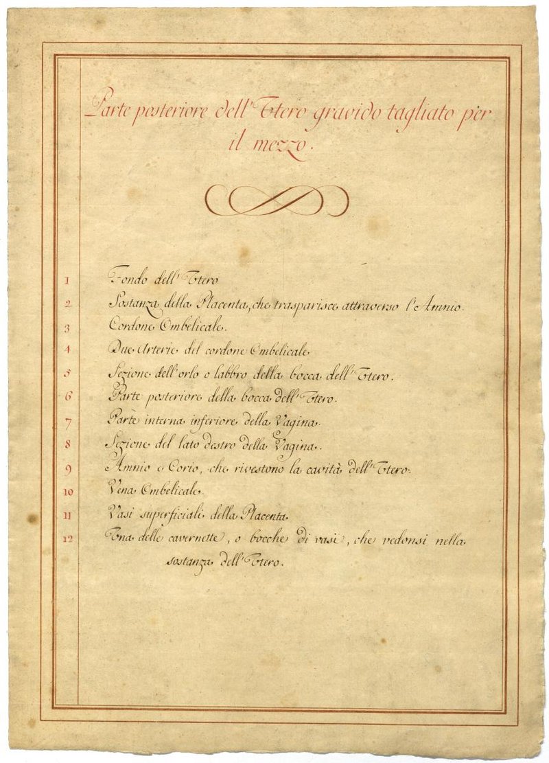 Der Text ist die ergänzende Beschreibung in italienischer Sprache zum anatomischen Wachsmodell einer Gebärmutter.