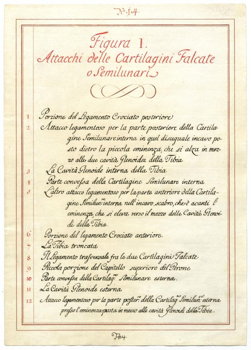 Der Text ist die ergänzende Beschreibung in italienischer Sprache zum anatomischen Wachsmodell des Knies.