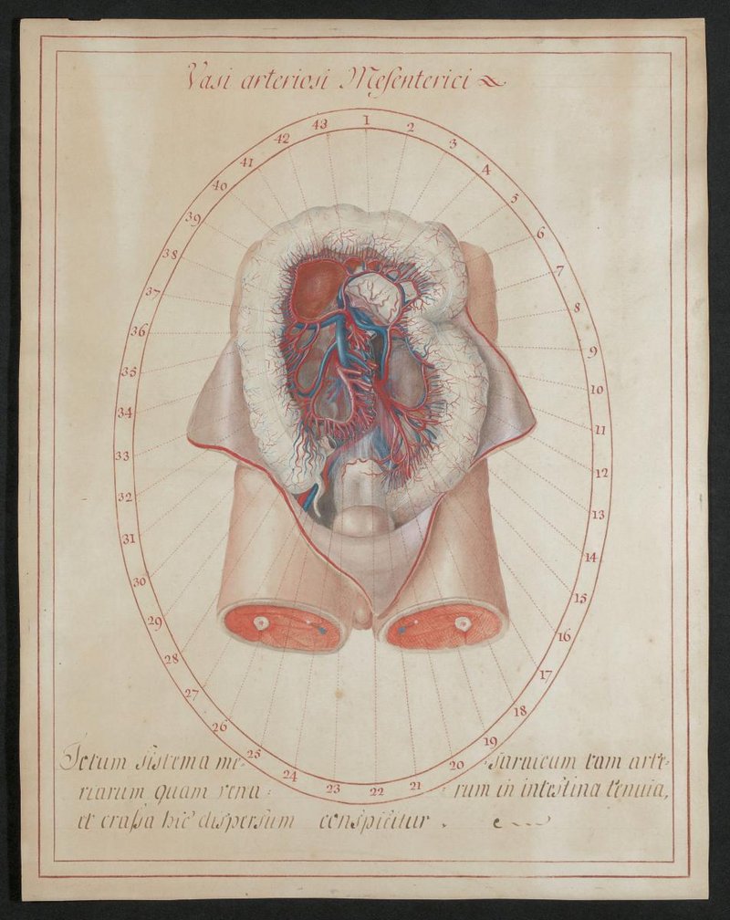 Eröffneter Bauchraum, Dünndarm ist entfernt und der Dickdarm zur besseren Übersicht vollständig ausgebreitet. Die arterielle Gefäßversorgung des Dickdarms aus Arteria mesenterica superior und Arteria mesenterica inferior ist dargestellt.