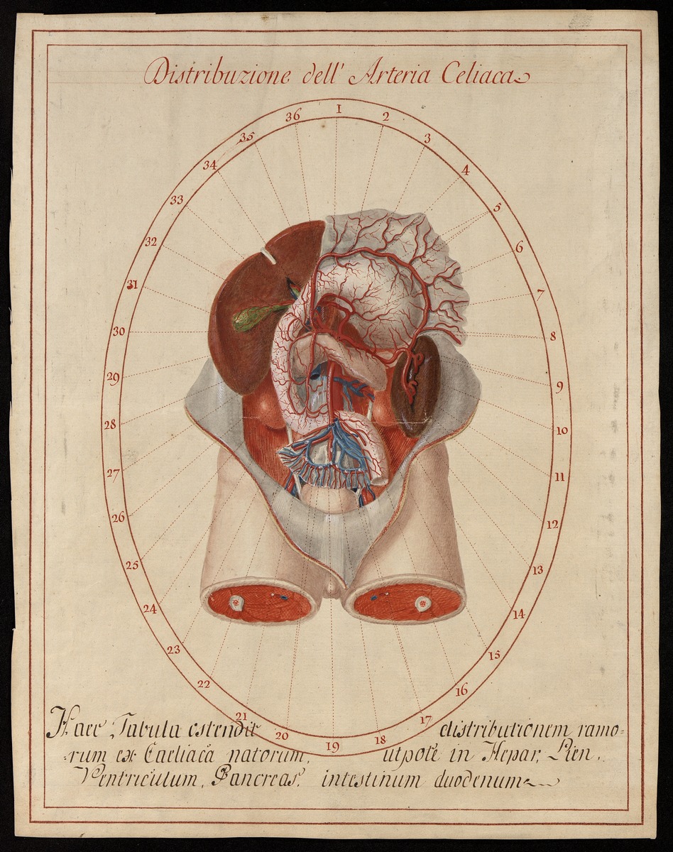 Eröffneter Bauchraum, Dünn- und Dickdarm bis auf den Zwölffingerdarm (Duodenum) sind entfernt und die Leber sowie der Magen sind nach oben geklappt. Der Truncus coeliacus sowie die Arteria mesenterica superior und ihre Äste sind dargestellt. Zu beachten ist das topographische Naheverhältnis der Bauchspeicheldrüse (Pancreas) zu diesen beiden Arterienstämmen.