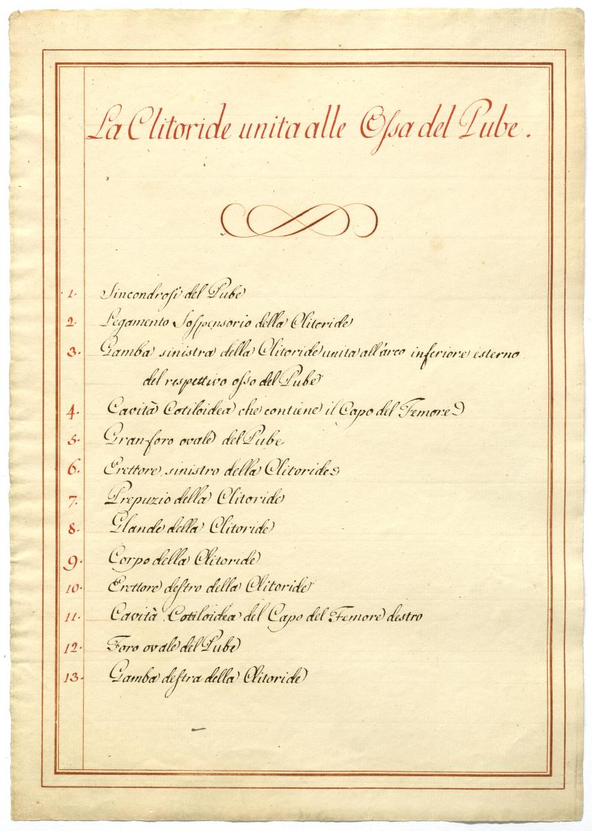 Der Text ist die ergänzende Beschreibung in italienischer Sprache zum anatomischen Wachsmodell der äußeren weiblichen Geschlechtsteile (Vulva).