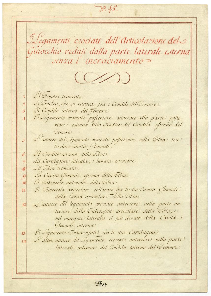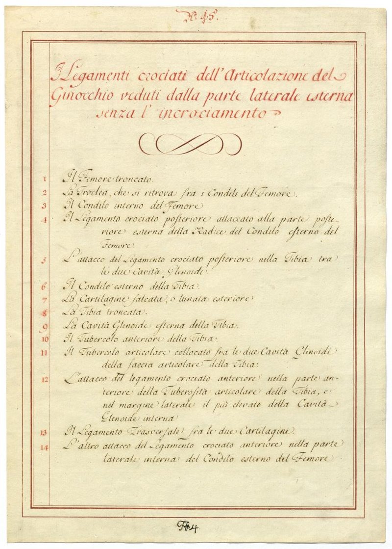 Der Text ist die ergänzende Beschreibung in italienischer Sprache zum anatomischen Wachsmodell des Knies.
