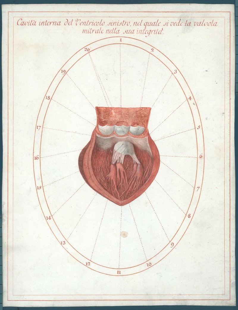 Die linke Herzkammer (Ventriculus cordis sinister) mit der Mitralklappe (Valva atrioventricularis sinistra [Valvula mitralis s. valvula bicuspidalis]) und der Anfang der eröffneten Hauptschlagader (Aorta) mit ihrer Klappe (Valva aortae) und dem Abgang der beiden Herzkranzarterien (Arteria coronaria cordis dextra und Arteria coronaria cordis sinistra).