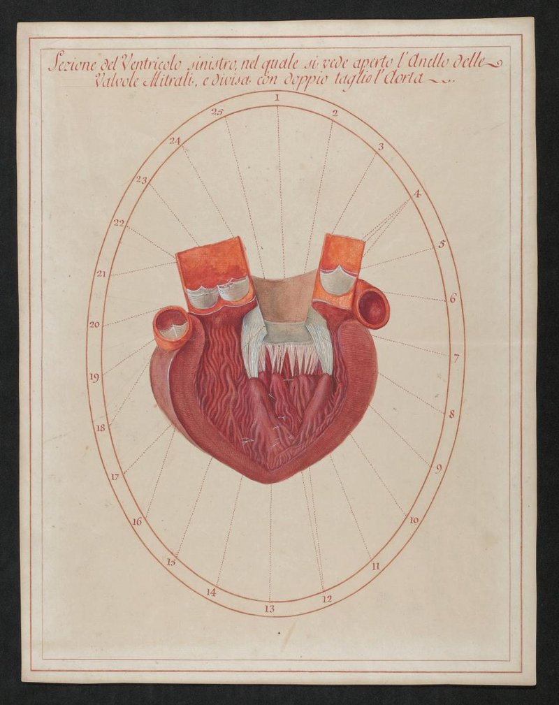 Die linke Herzkammer (Ventriculus cordis sinister) mit der Mitralklappe (Valva atrioventricularis sinistra [Valvula mitralis / Valvula bicuspidalis]) und der Aortenklappe (Valva aortae [Valvulae semilunares aortae]) sowie der eröffnete linke Vorhof (Atrium cordis sinistrum).