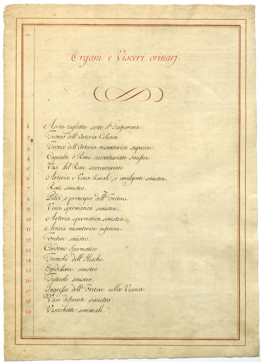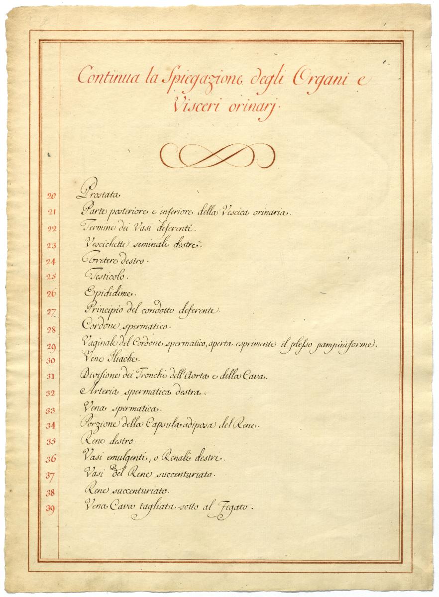 Der Text ist die ergänzende Beschreibung in italienischer Sprache zum anatomischen Wachsmodell der retroperitonealen und subperitonealen Organe des Mannes.
