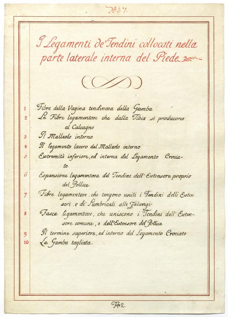 Der Text ist die ergänzende Beschreibung in italienischer Sprache zum anatomischen Wachsmodell des Fußes.