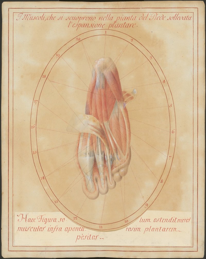 Rechter Fuß von plantar, die Muskeln der Fußsohle nach Entfernung der Aponeurosis plantaris (Plantarfaszie): Musculus abductor digiti minimi, Musculus quadratus plantae, Musculus flexor digiti minimi brevis (kurzer Kleinzehenbeuger), Musculus interosseus III., Musculus flexor digitorum brevis, Musculus lumbricalis III. und Musculus lumbricalis Ivena, Musculus flexor hallucis longus (langer Großzehenbeuger) und Musculus flexor hallucis brevis (kurzer Großzehenbeuger) sowie Musculus abductor hallucis.