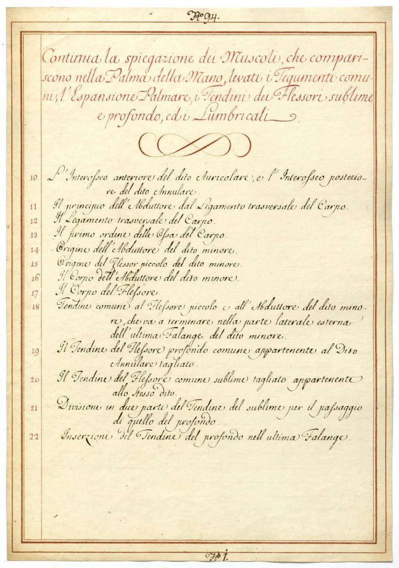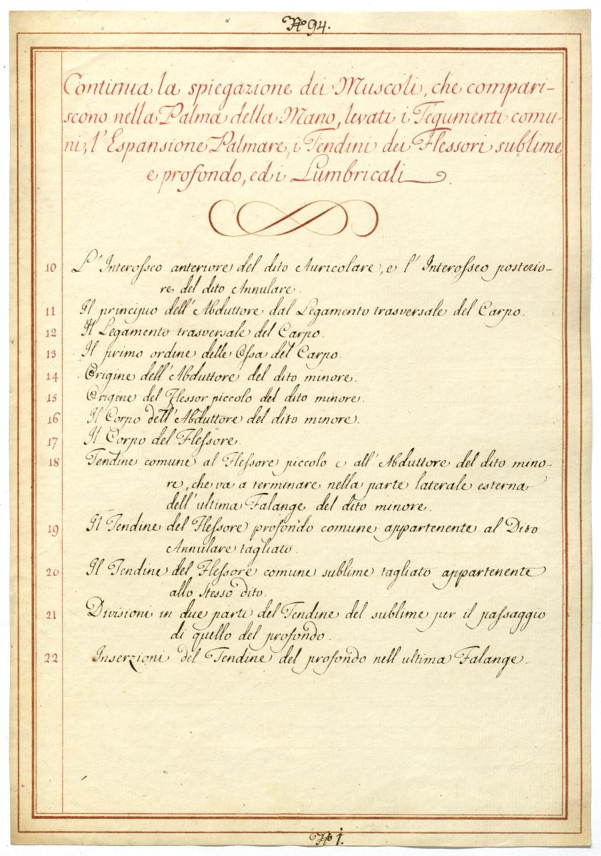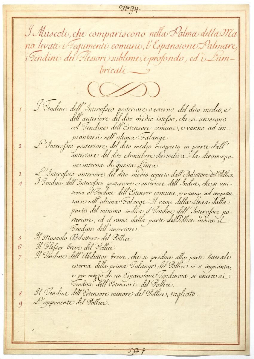 Der Text ist die ergänzende Beschreibung in italienischer Sprache zum anatomischen Wachsmodell der Handmuskulatur.