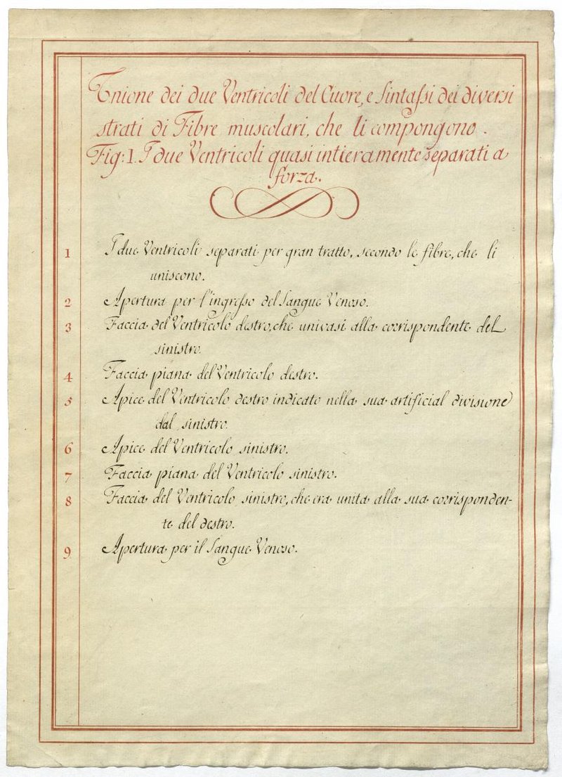 Der Text ist die ergänzende Beschreibung in italienischer Sprache zum anatomischen Wachsmodell des Herzens.