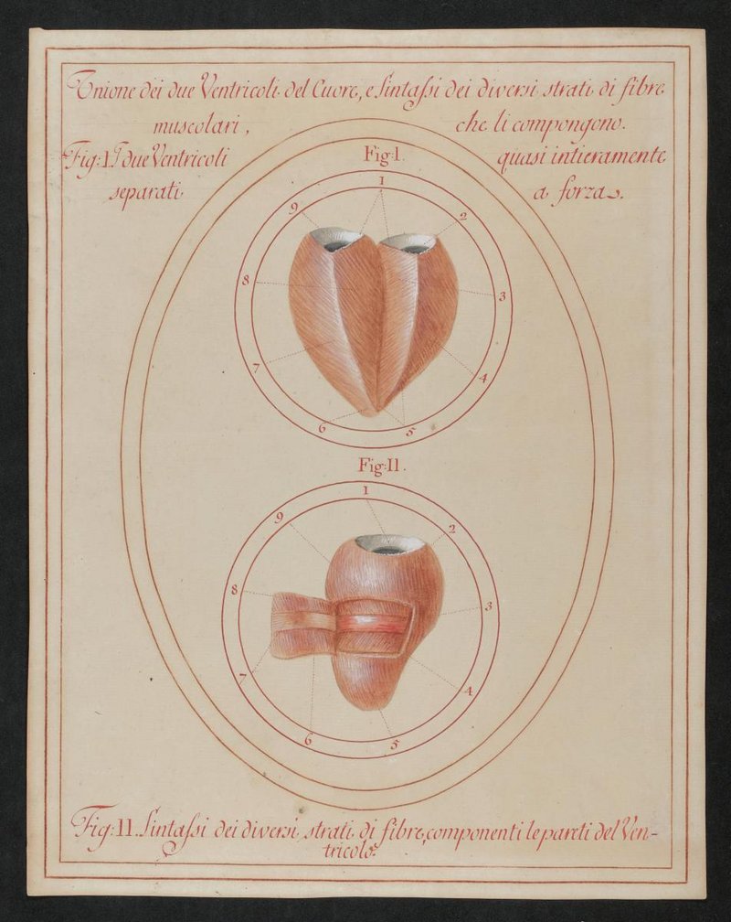 Fig. 1: 137/1: Die Muskulatur der beiden Herzkammern (Ventriculi cordis), die etwas auseinandergezogen sind. Fig 2: 137/4: Die verschiedenen Muskelschichten der rechten Herzkammer (Ventriculus cordis dexter).