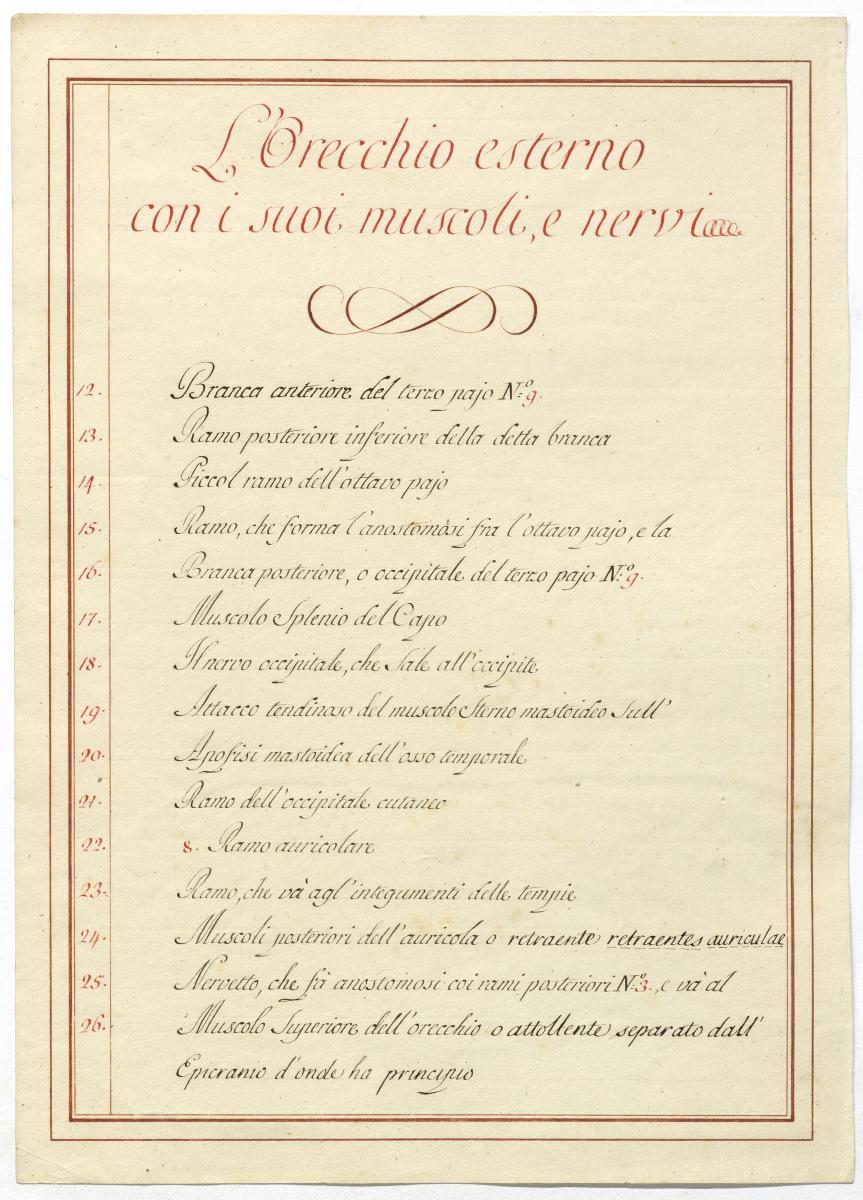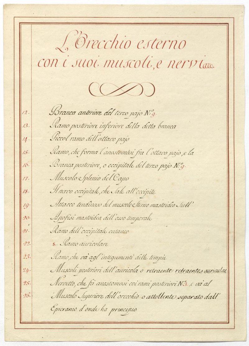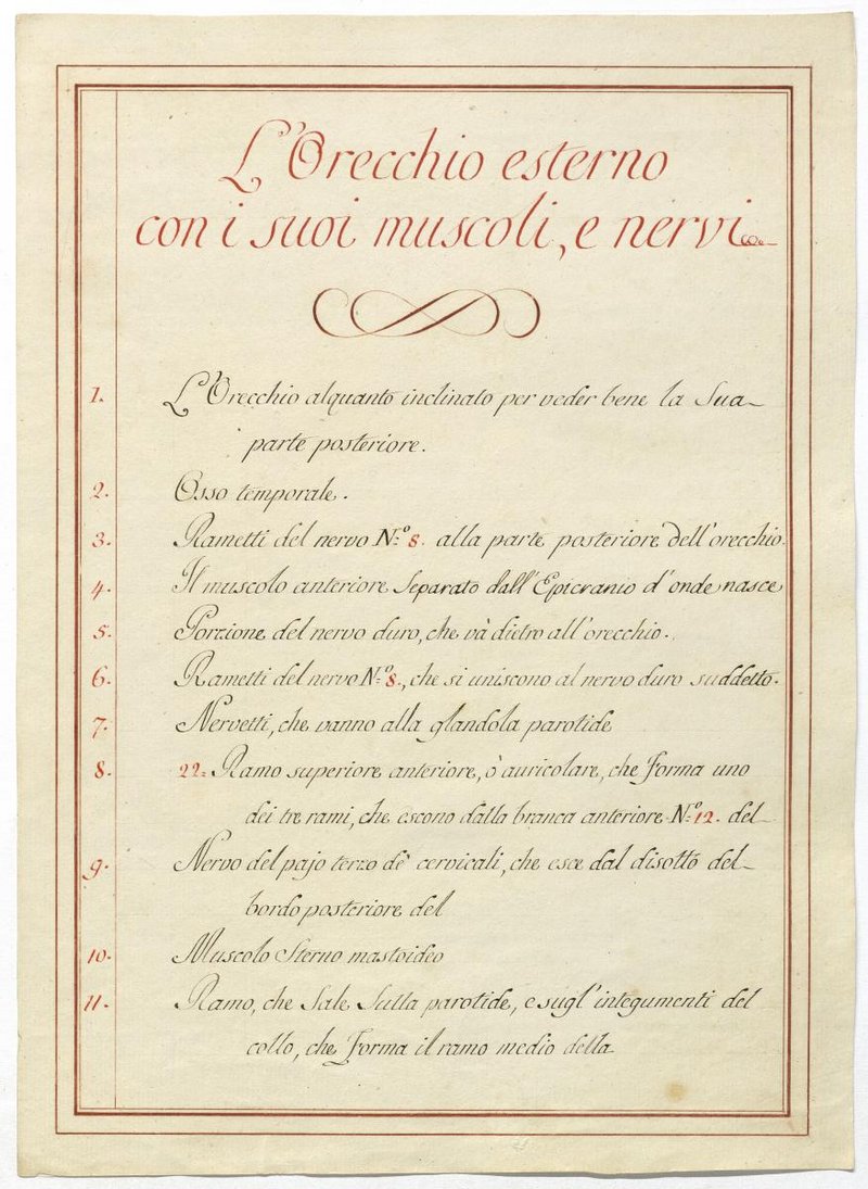 Der Text ist die ergänzende Beschreibung in italienischer Sprache zum anatomischen Wachsmodell des Ohres.
