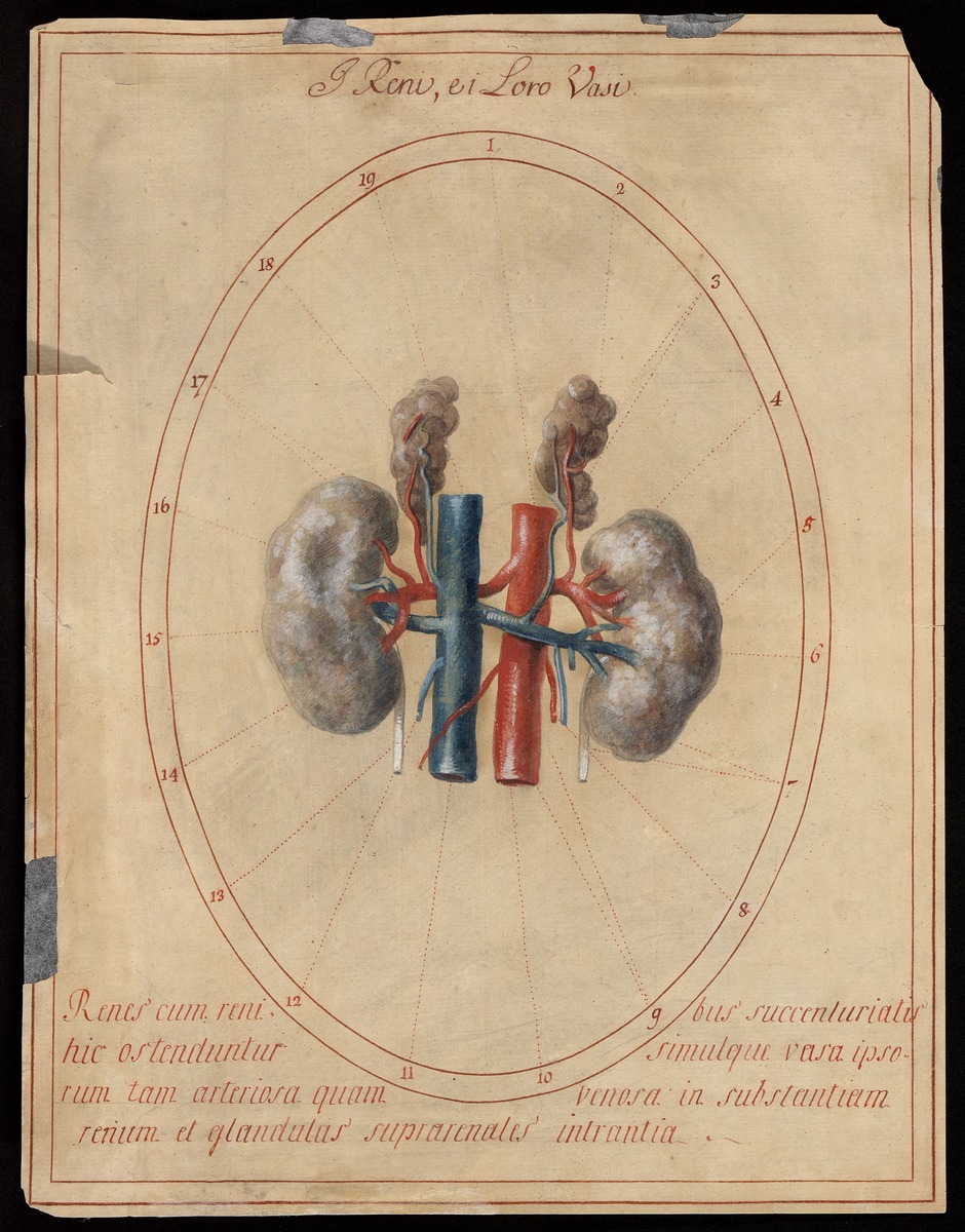 Isoliertes Modell der Nieren (Renes) und der Nebennieren (Glandulae suprarenales) mit ihren Gefäßen (Vasa renalia et vasa suprarenaia) sowie deren Anbindung an den Zufluss über die Hauptschlagader (Aorta) und an den Abfluss über die untere Hohlvene (Vena cava inferior – Achtung – hier gibt es einen korrekt dargestellten Seitenunterschied!).