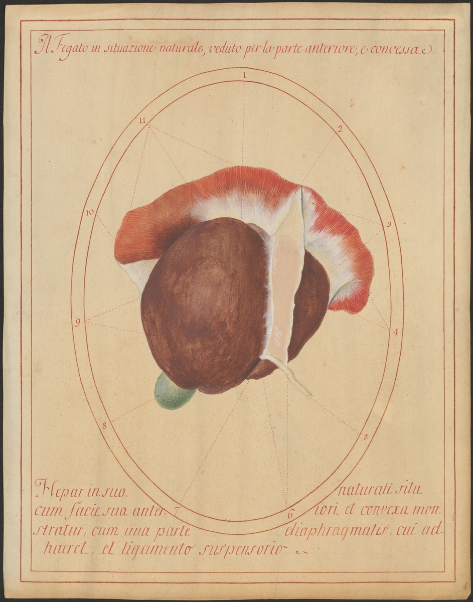 Ansicht der Leber von vorne-oben. Man sieht die Anheftungsstelle der Leber am Zwerchfell sowie das zwischen Ligamentum teres hepatis und Zwerchfell aufgespannte Ligamentum falciforme hepatis. Am freien Rand der Leber sieht man mit ihrem Fundus einen kleinen Teil der Gallenblase (Fundus vesicae felleae).