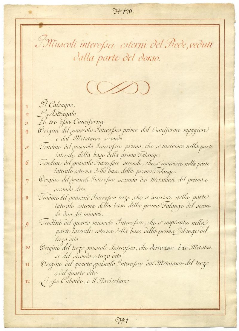 Der Text ist die ergänzende Beschreibung in italienischer Sprache zum anatomischen Wachsmodell der Muskeln zwischen den Mittelfußknochen.