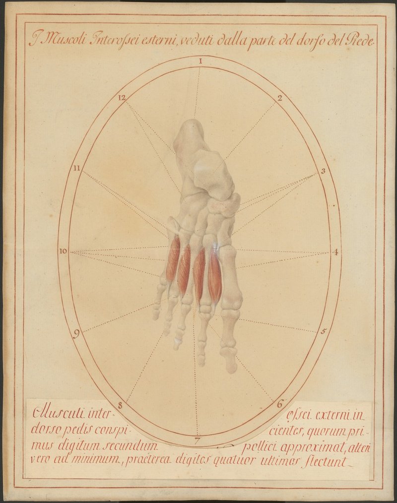 Linkes Fußskelett von dorsal, Musculi interossei dorsales.