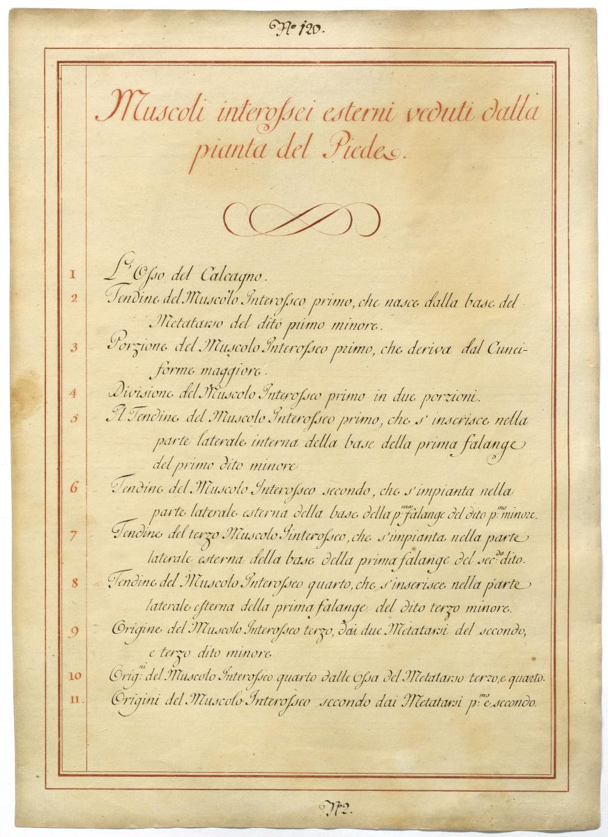 Der Text ist die ergänzende Beschreibung in italienischer Sprache zum anatomischen Wachsmodell der Muskeln zwischen den Mittelfußknochen.