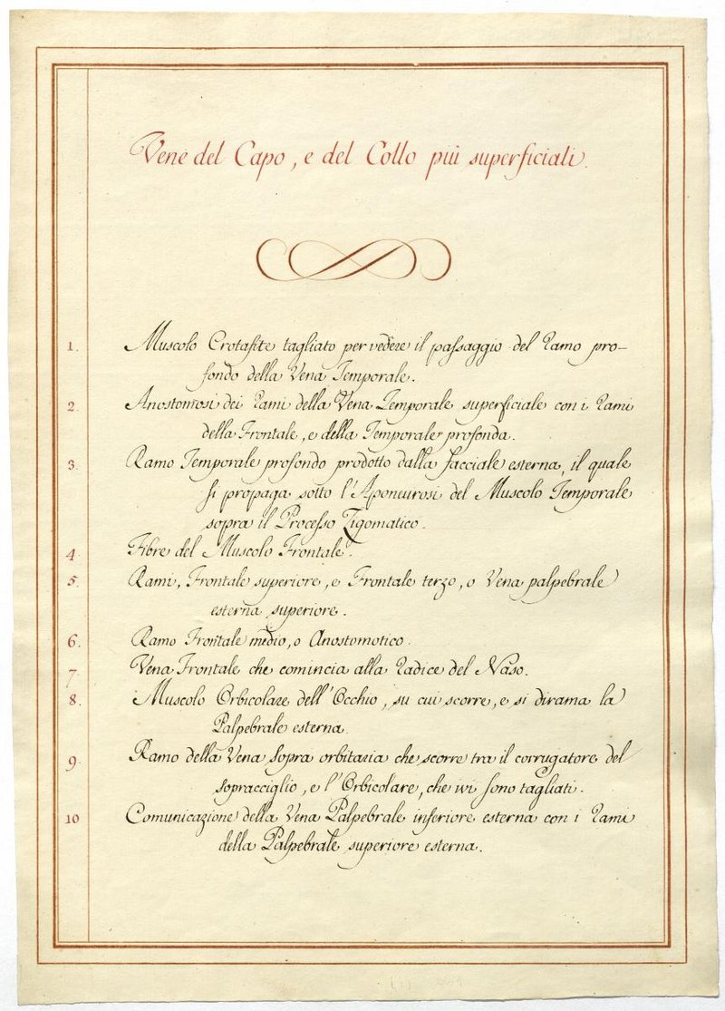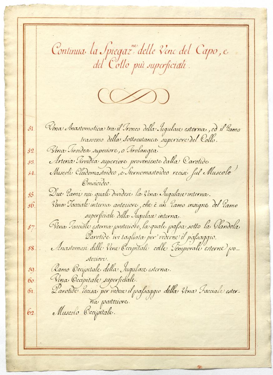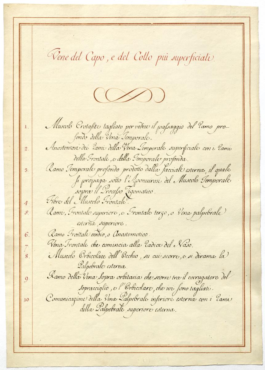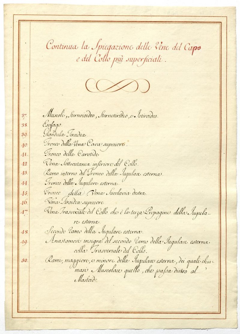 Der Text ist die ergänzende Beschreibung in italienischer Sprache zum anatomischen Wachsmodell den Kopf-Hals-Venen.