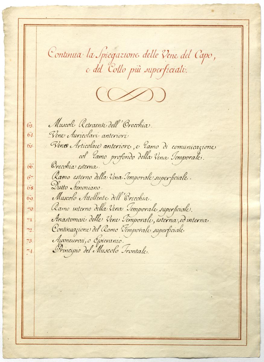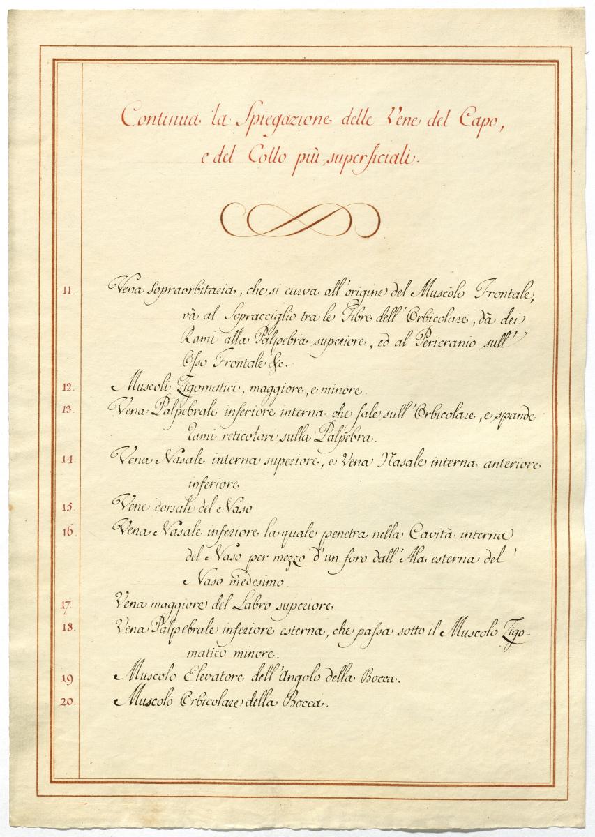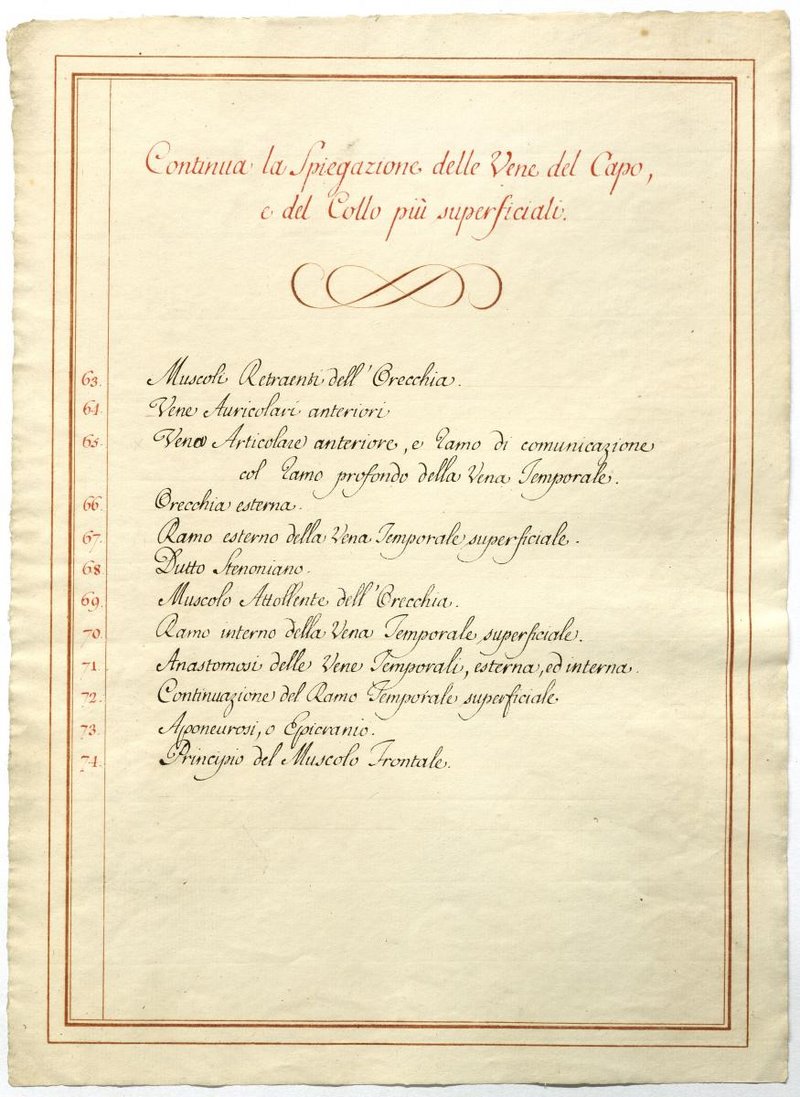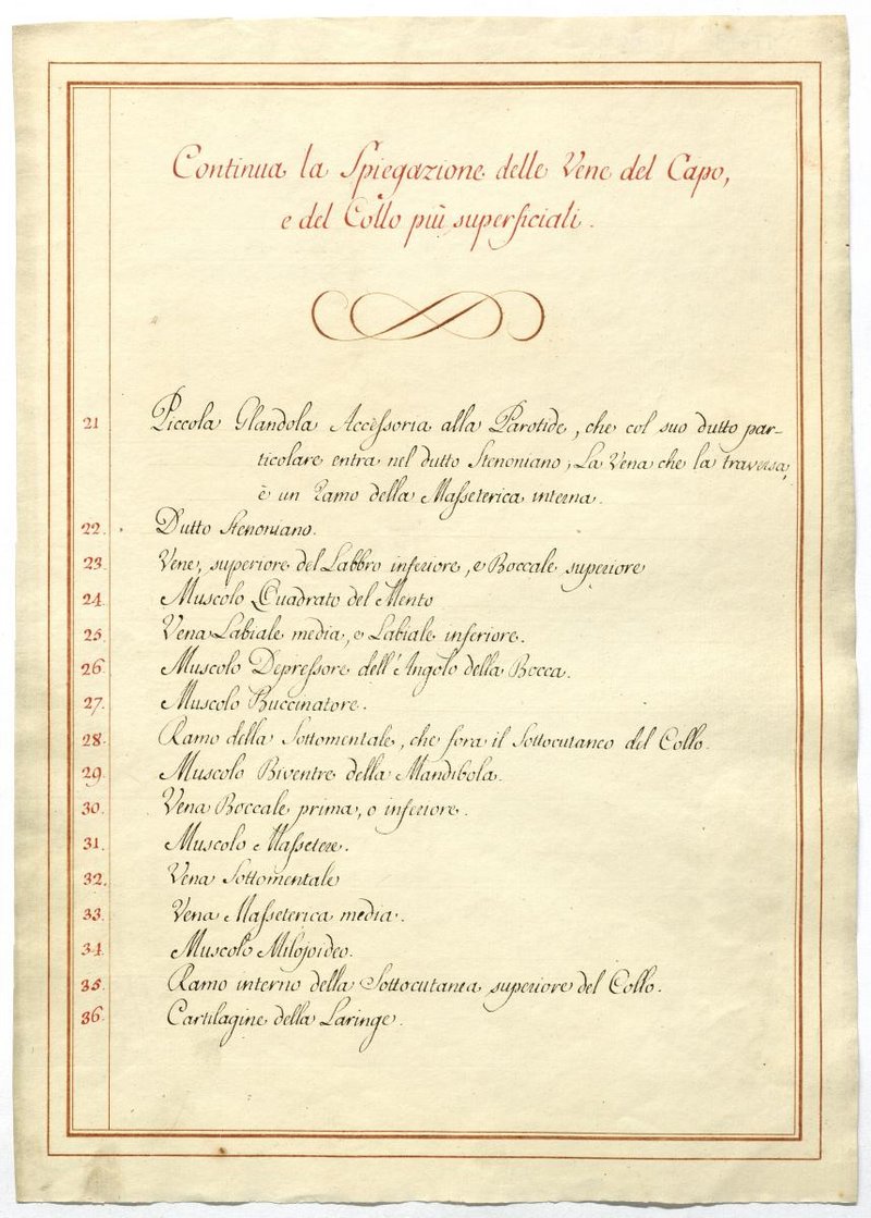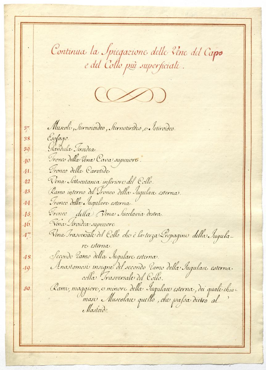Der Text ist die ergänzende Beschreibung in italienischer Sprache zum anatomischen Wachsmodell den Kopf-Hals-Venen.