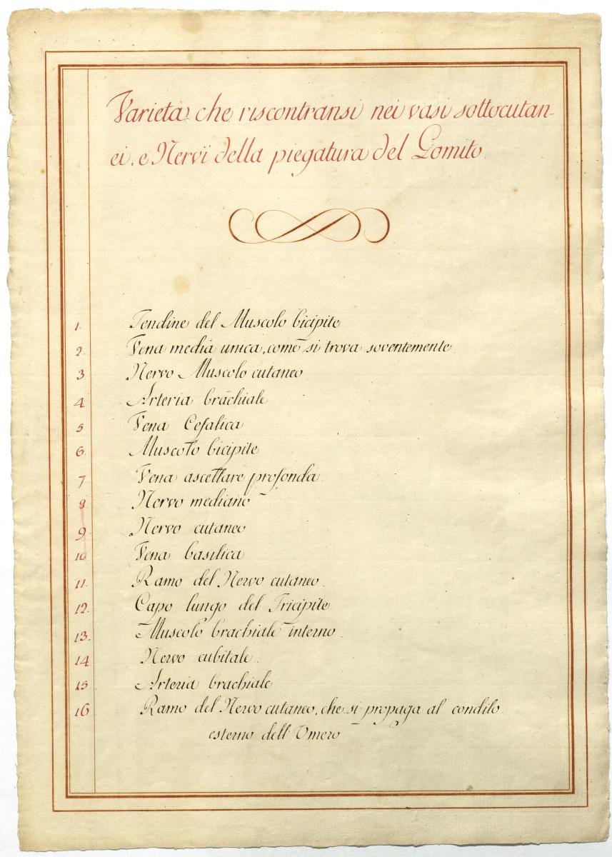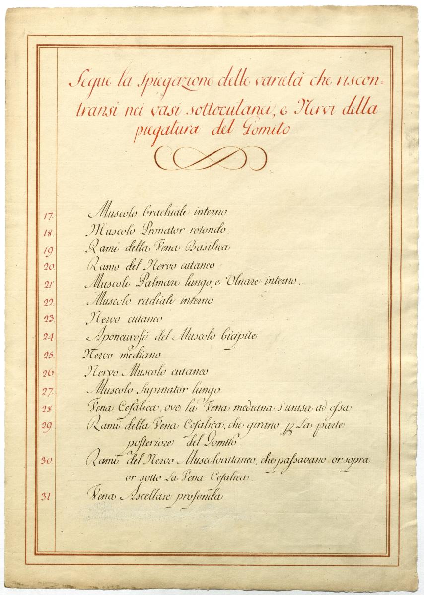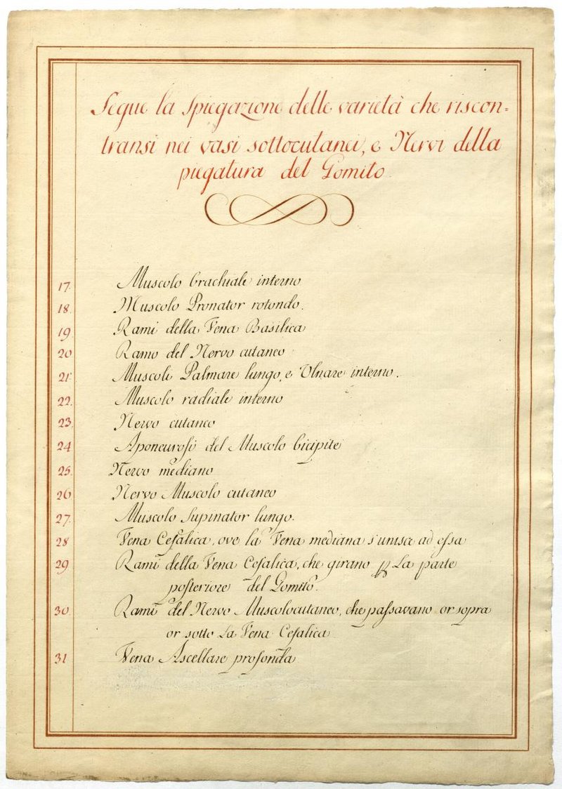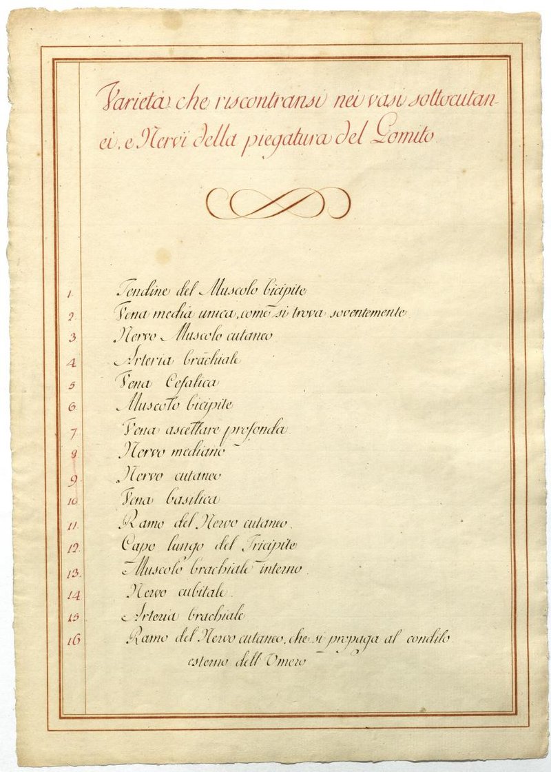 Der Text ist die ergänzende Beschreibung in italienischer Sprache zum anatomischen Wachsmodell der oberflächliche Leitungsbahnen des Armes.