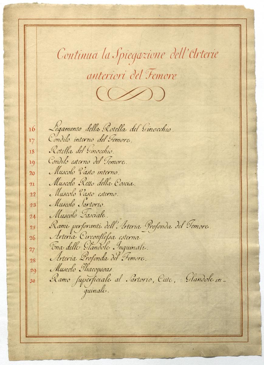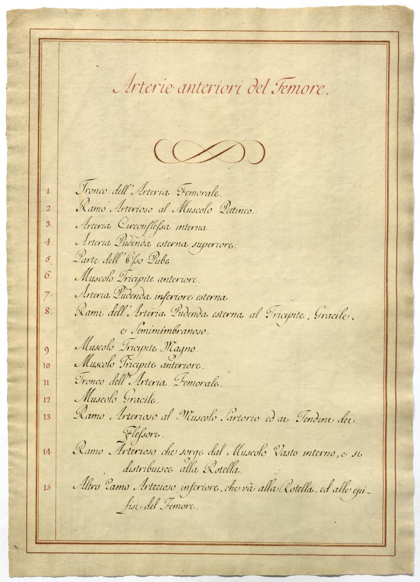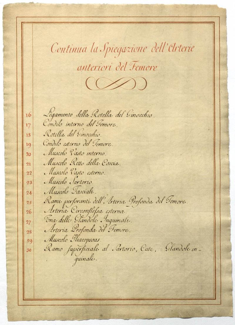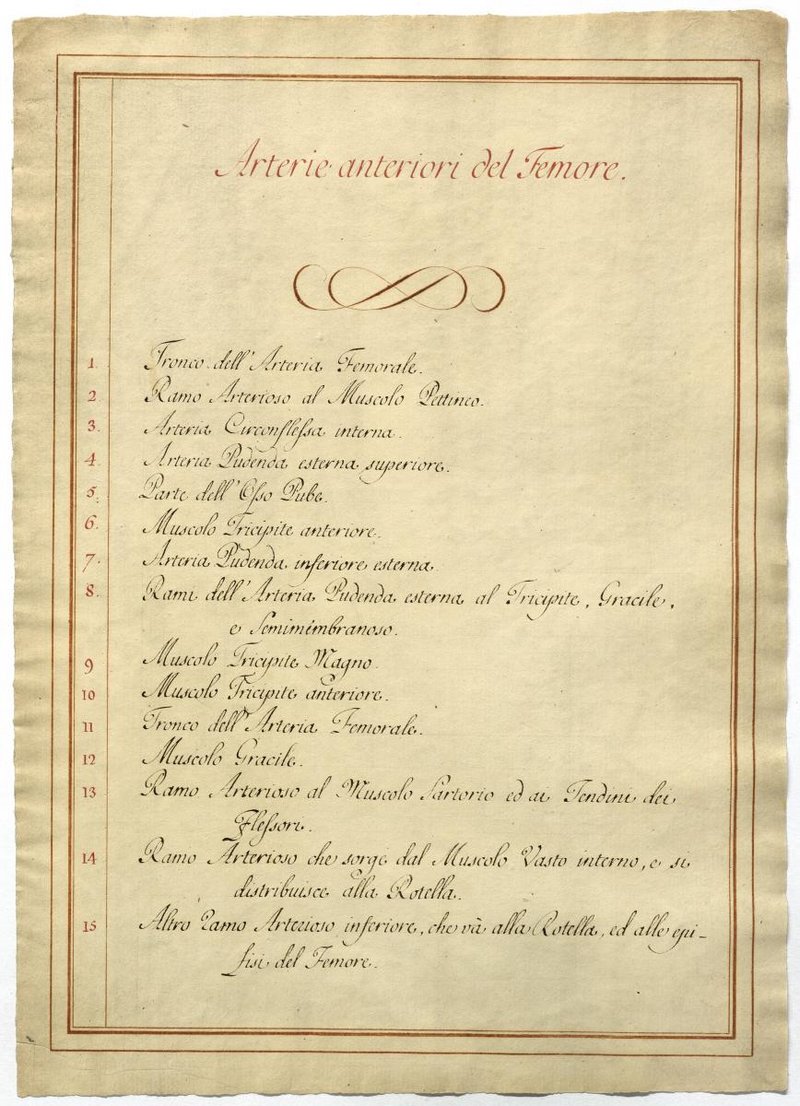 Der Text ist die ergänzende Beschreibung in italiensicher Sprache zum anatomischen Wachsmodell der Oberschenkelarterie.