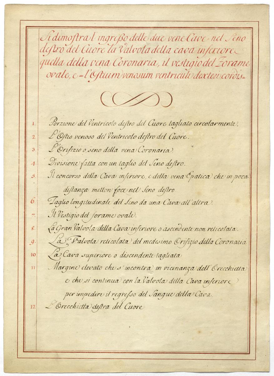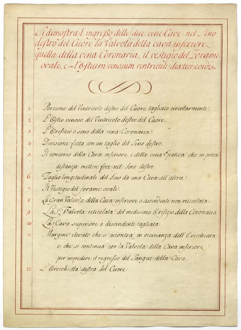 Der Text ist die ergänzende Beschreibung in italienischer Sprache zum anatomischen Wachsmodell der Herzräume.