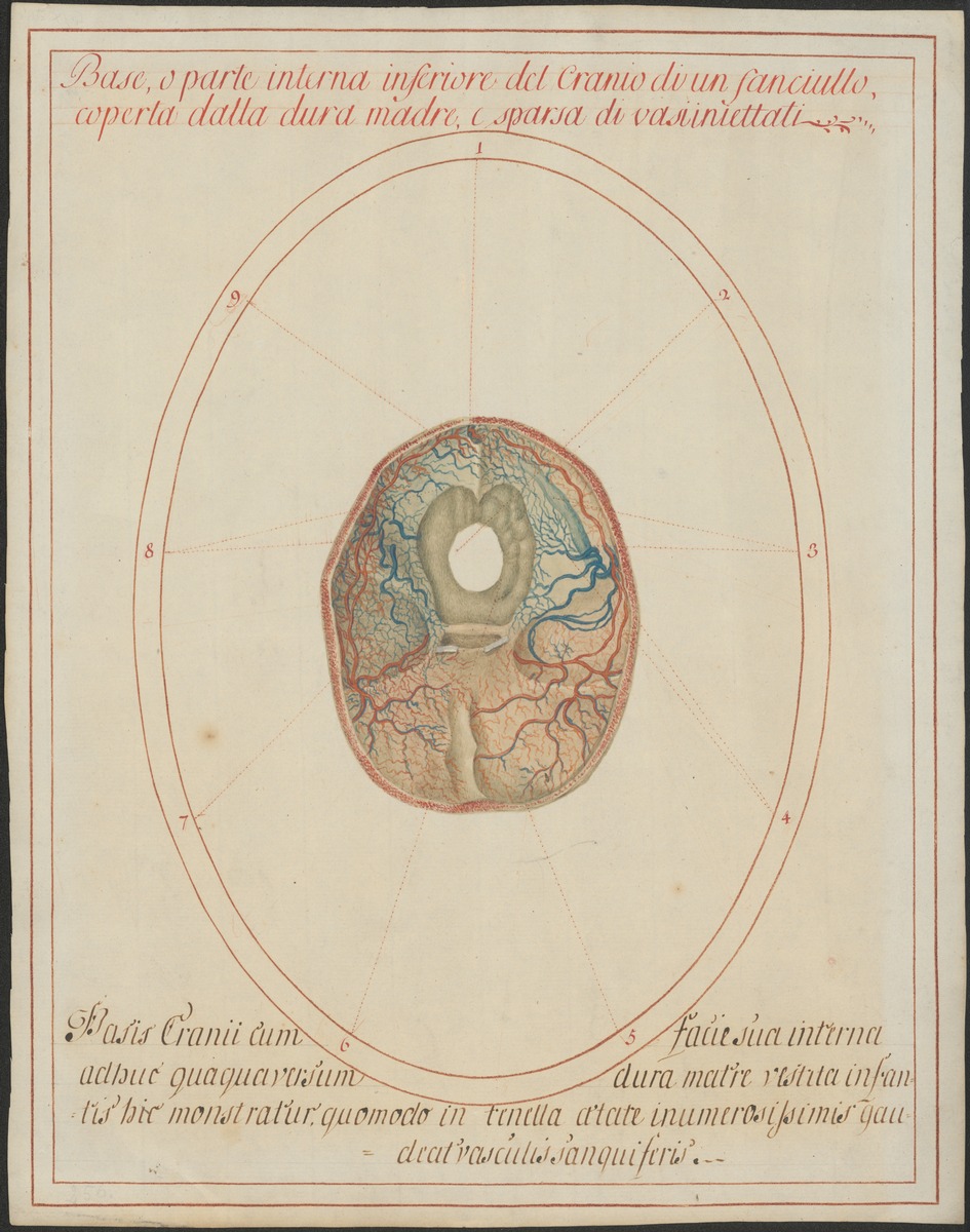 Die Schädelbasis (Basis cranii interna) mit der harten Hirnhaut (Dura mater encephali) und ihren Blutgefäßen bei einem Kind.