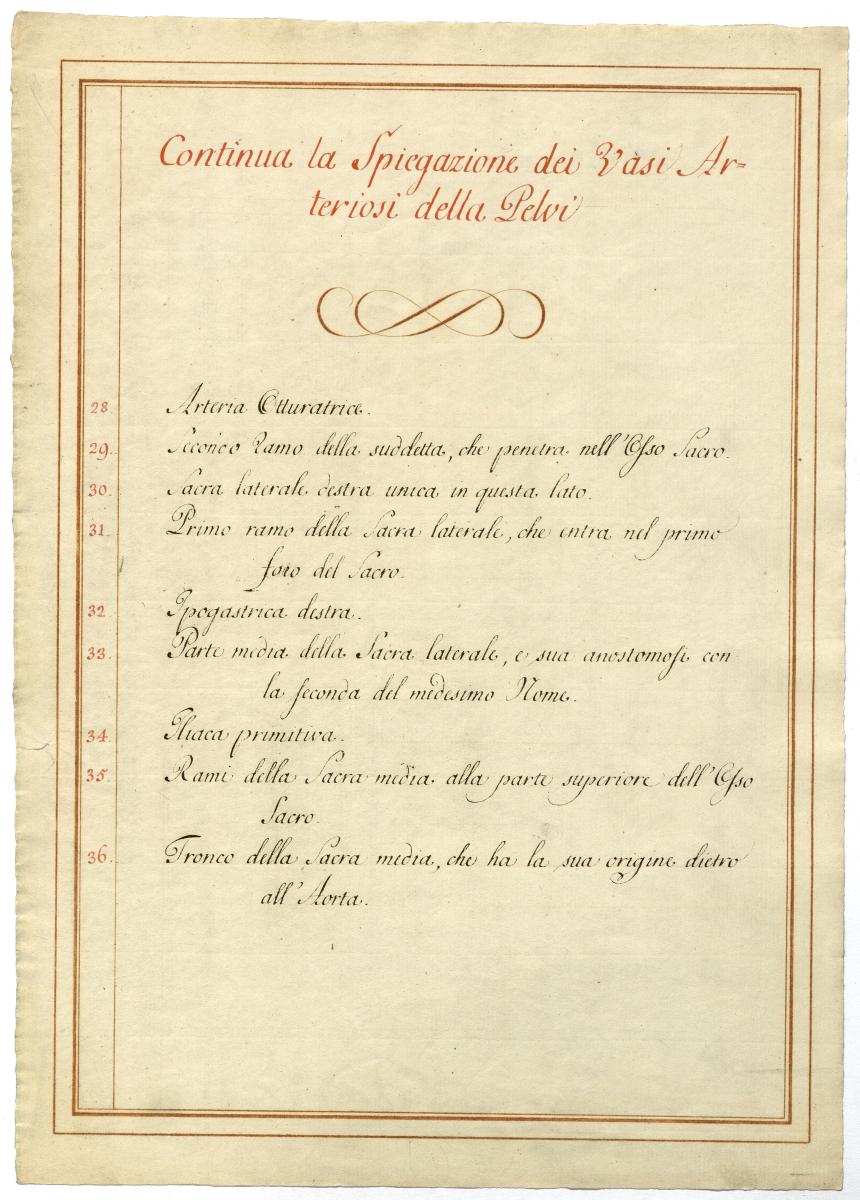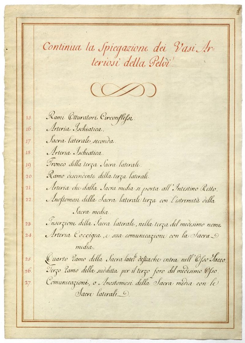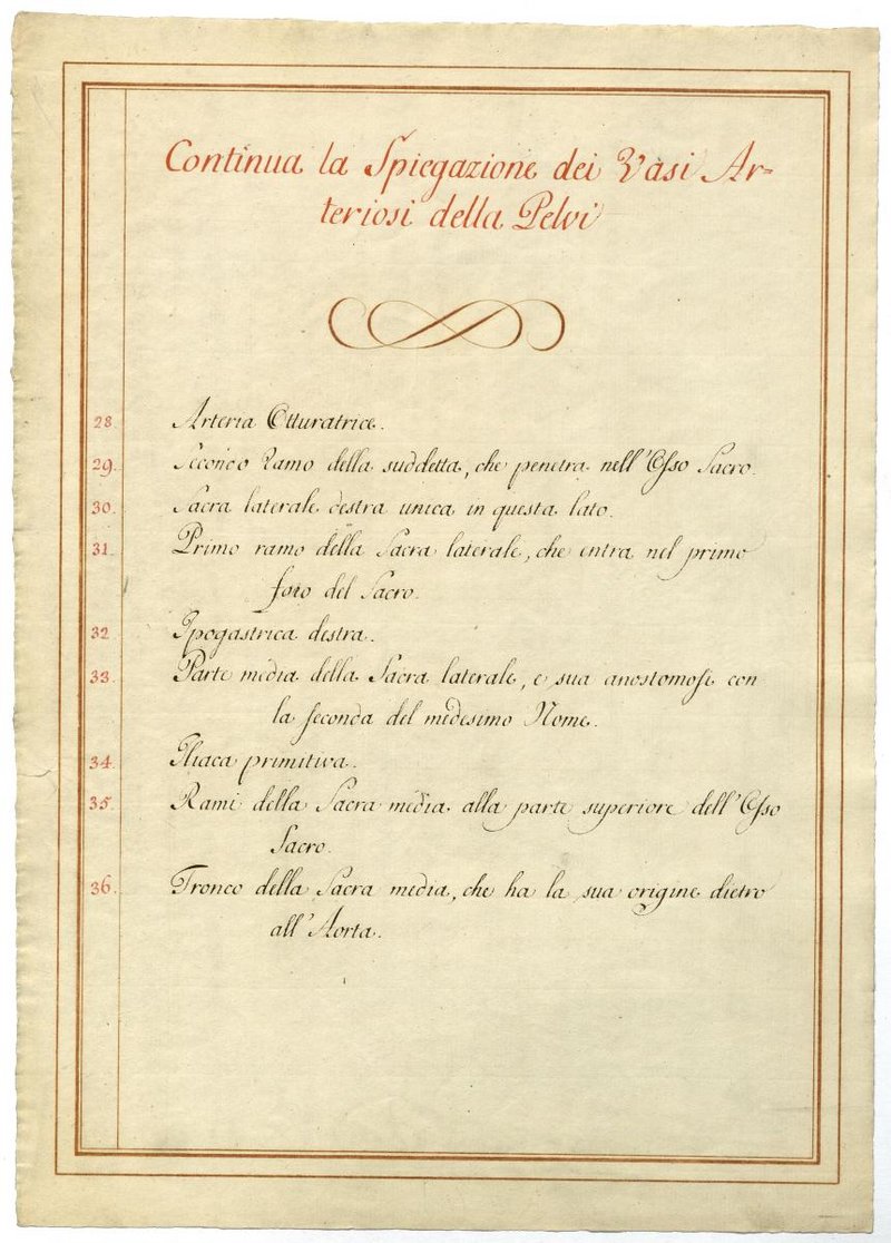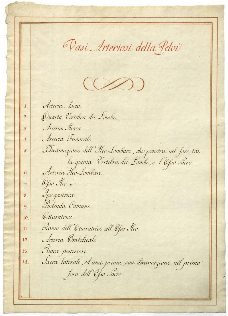 Der Text ist die ergänzende Beschreibung in italienischer Sprache zum anatomischen Wachsmodell der Beckenarterien.