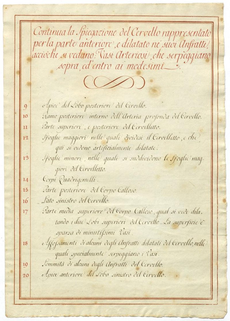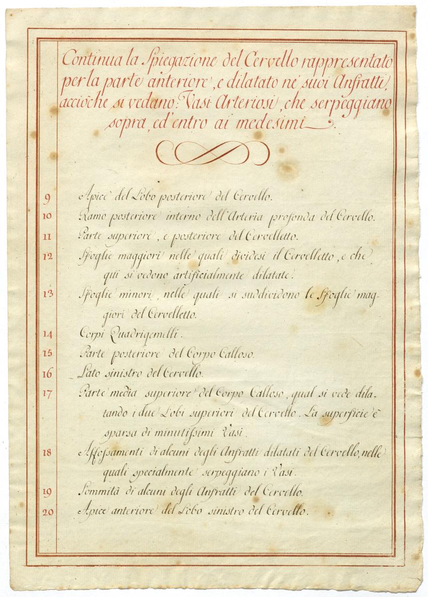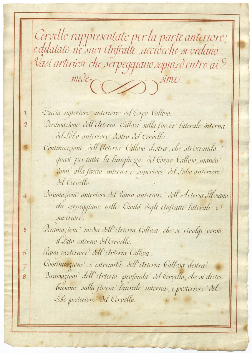 Der Text ist die ergänzende Beschreibung in italienischer Sprache zum anatomischen Wachsmodell der Gehirnarterien.