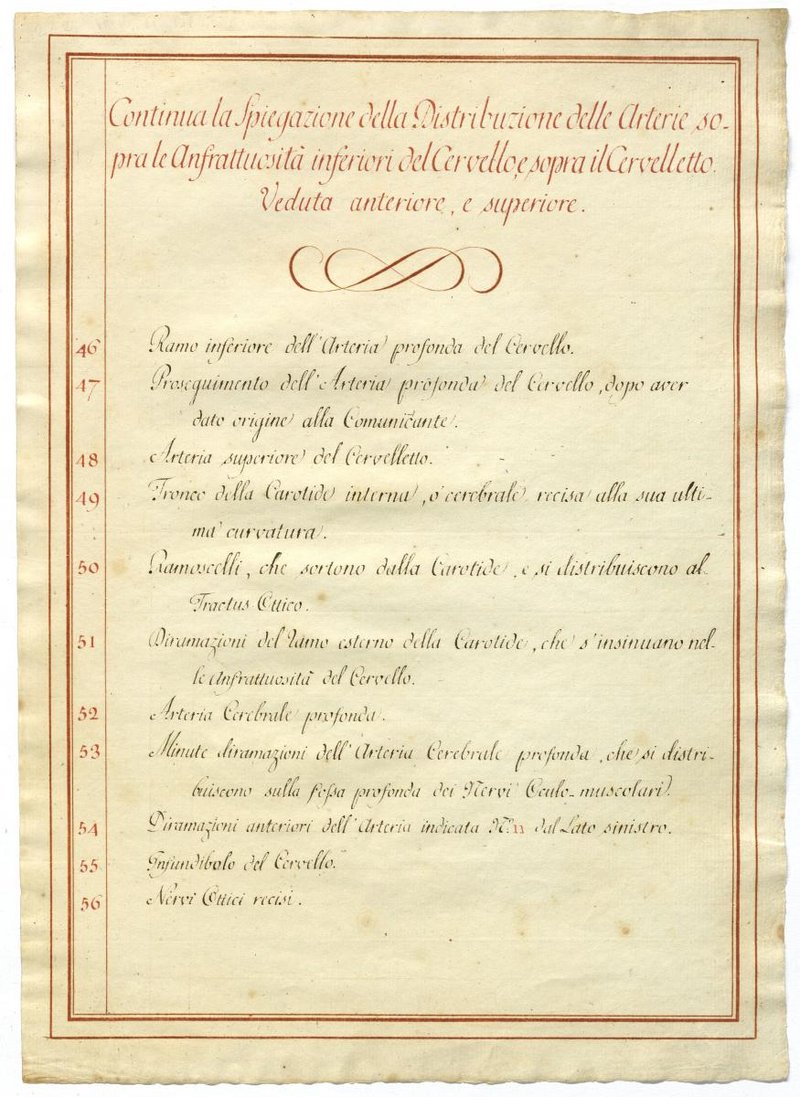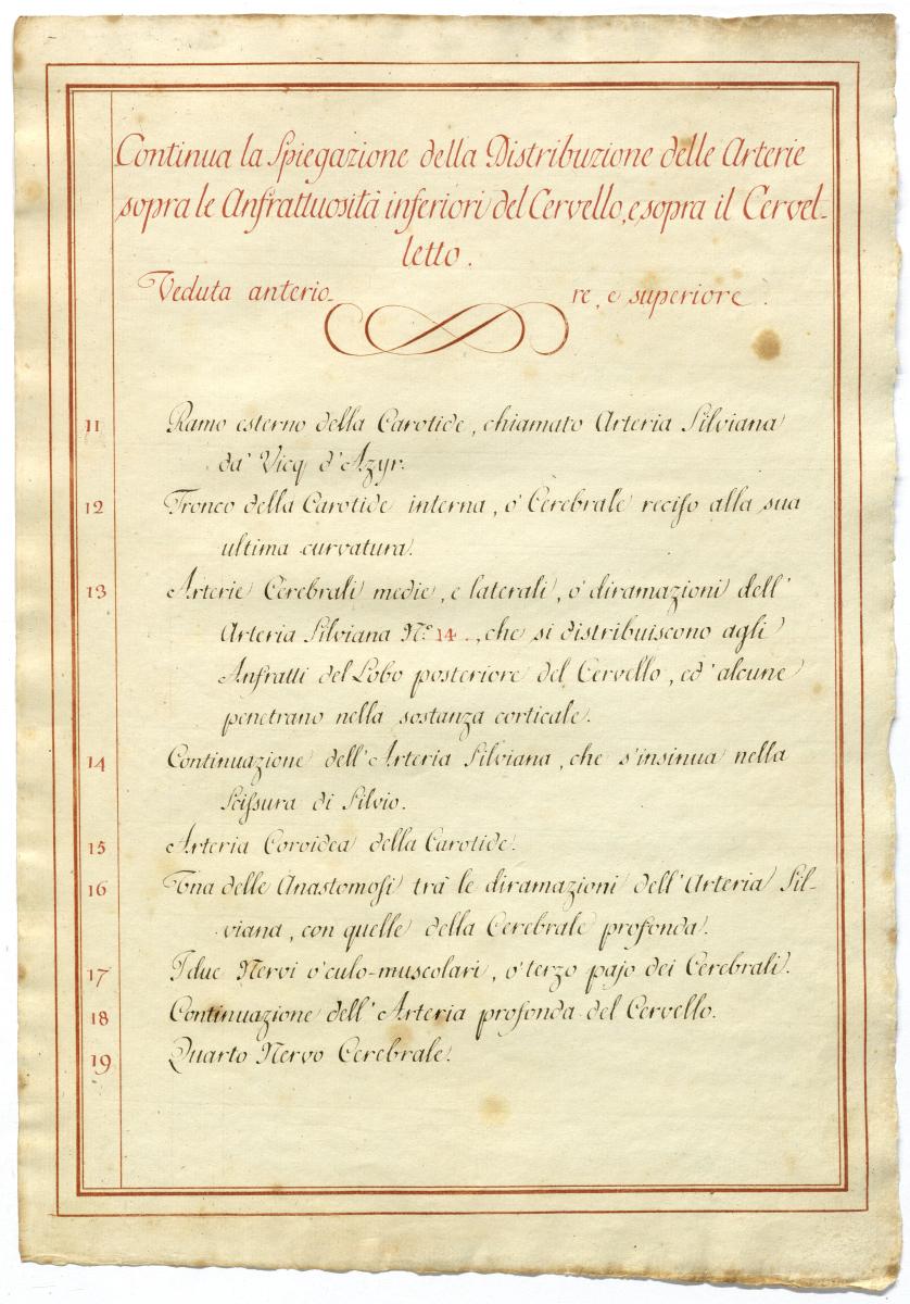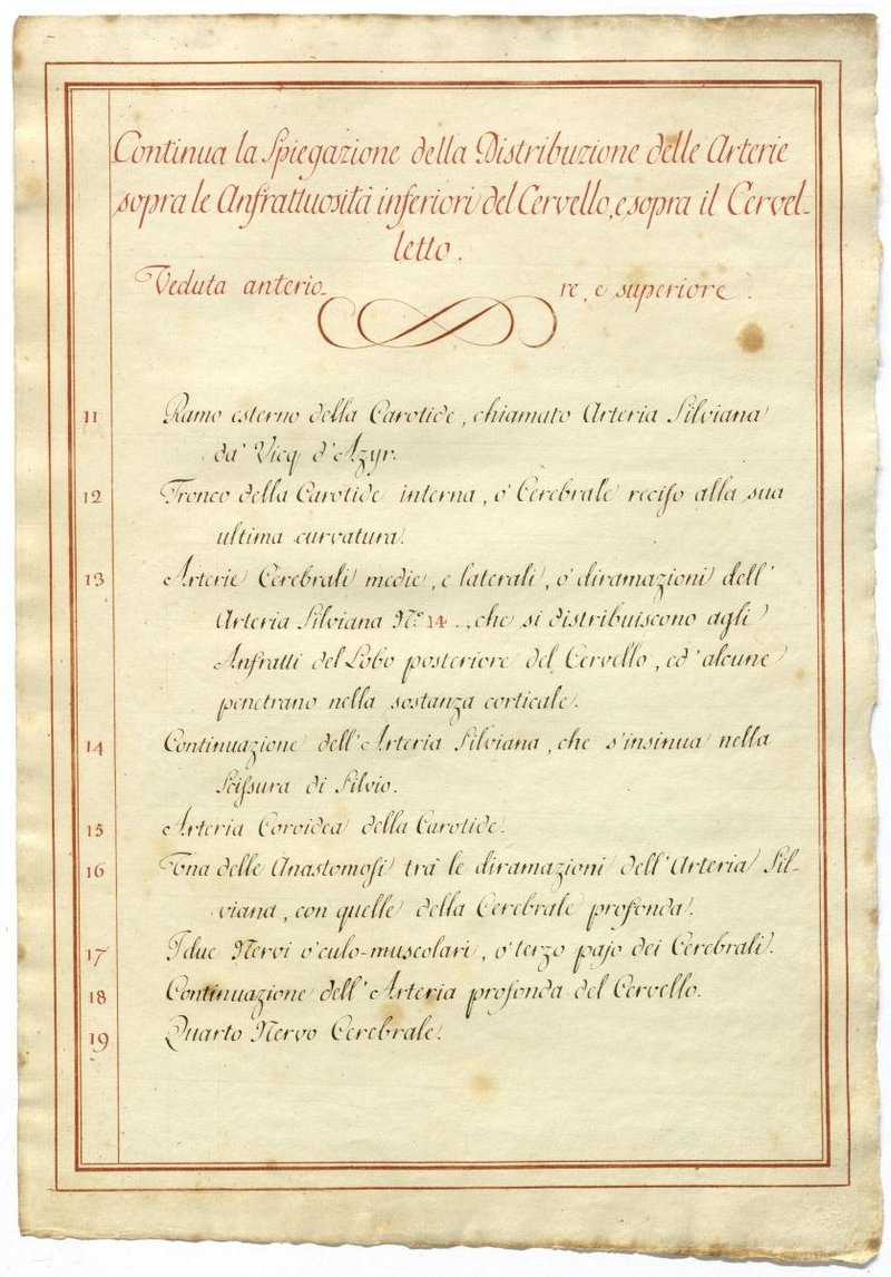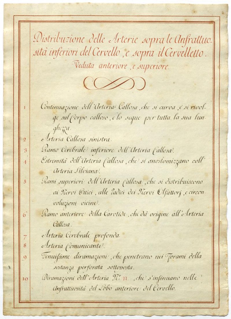 Der Text ist die ergänzende Beschreibung in italienischer Sprache zum anatomischen Wachsmodell der Gehirnarterien.