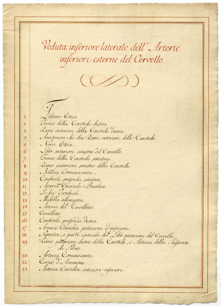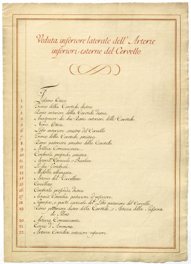 Der Text ist die ergänzende Beschreibung in italienischer Sprache zum anatomischen Wachsmodell der Hirnarterien.