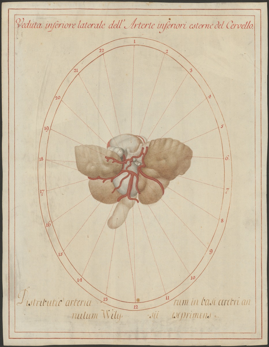 Die Arterien an der Unterseite des Gehirns (Basis cerebri) mit dem von ihnen gebildeten Circulus arteriosus cerebri [Willisi] und den ihm anliegenden Gehirnteilen. Zur besseren Übersicht ist der rechte Stirnlappen entfernt.