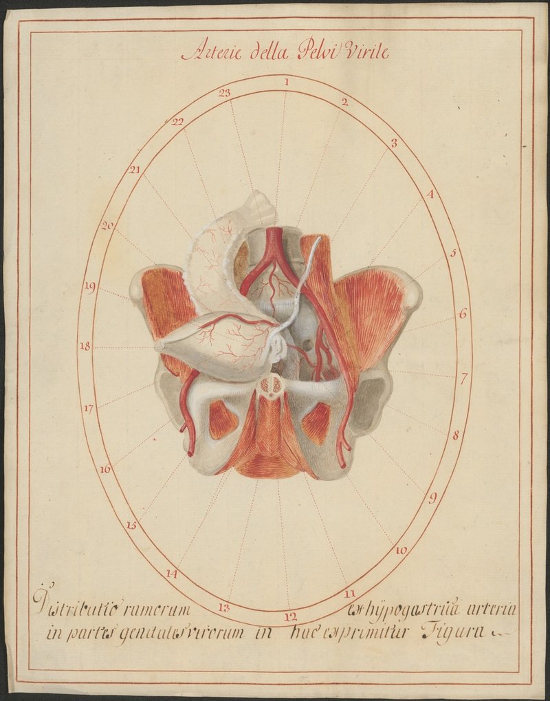 Die Arterien des männlichen Beckens, von vorn oben. Die Blase (Vesica urinaria) und der Mastdarm (Rectum) wurden auf die rechte Seite gedrängt. So werden die Äste der Arteria iliaca interna zu den Beckenorganen ansichtig.