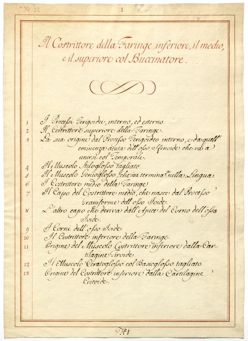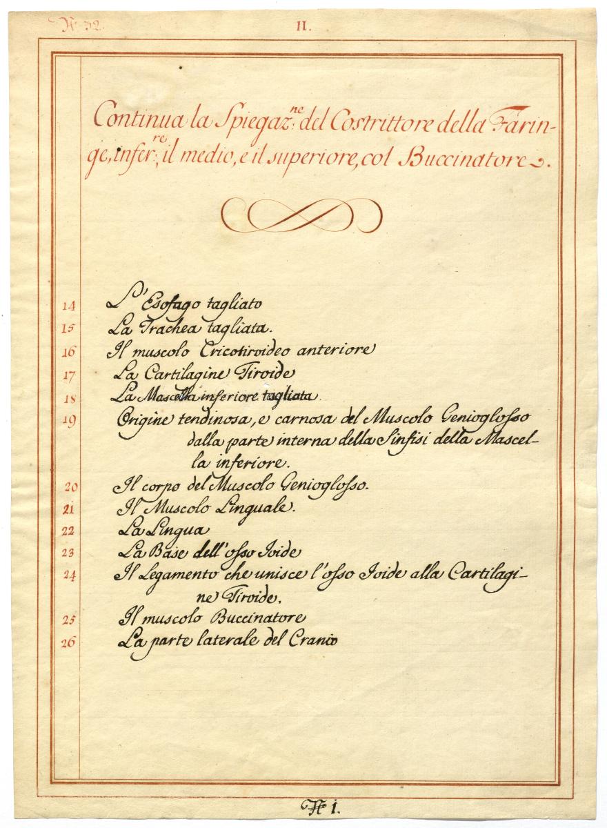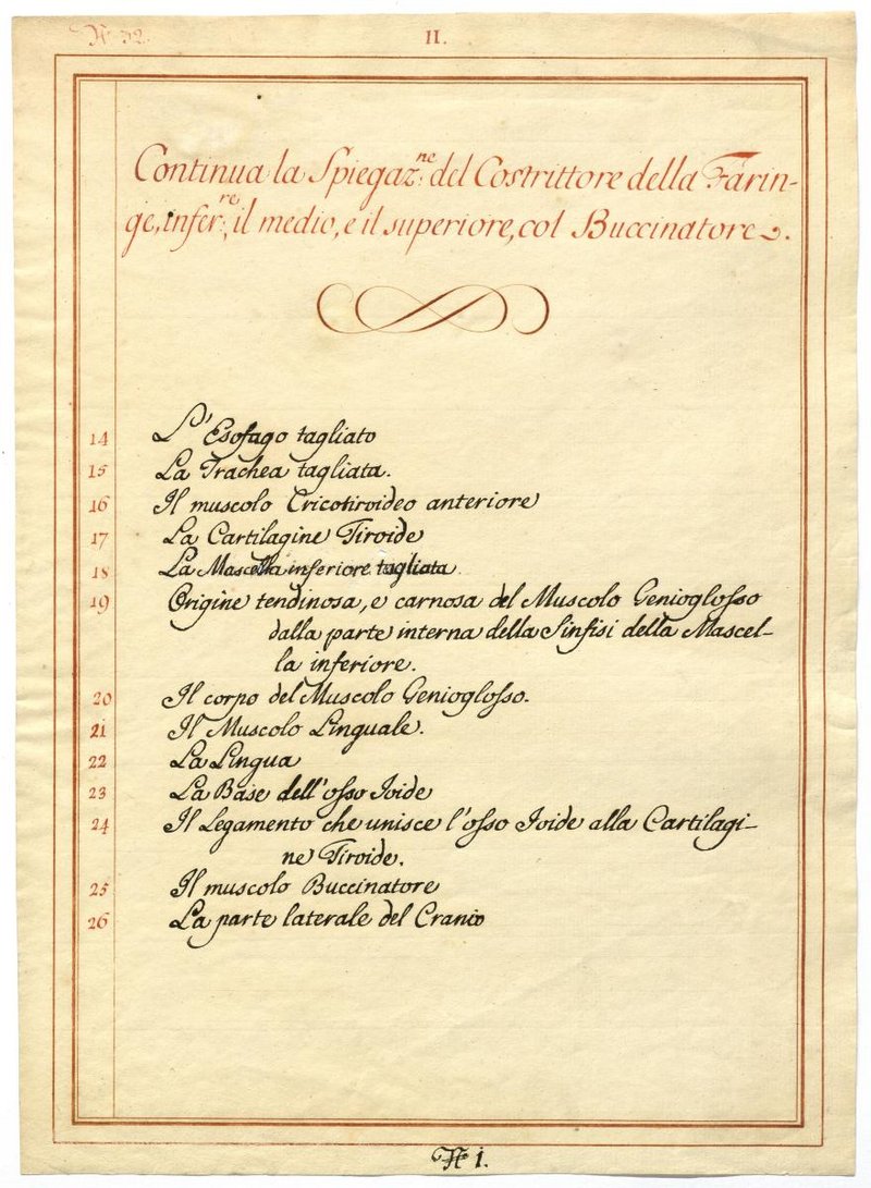Der Text ist die ergänzende Beschreibung in italienischer Sprache zum anatomischen Wachsmodell der Rachenmuskulatur.