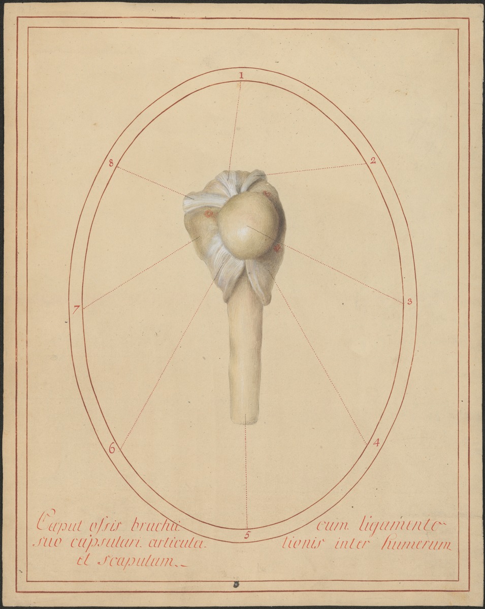 Der exartikulierte Kopf des Oberarmknochens (Caput humeri) mit der eröffneten und umgeschlagenen Gelenkkapsel (Capsula articularis), den durchtrennten Sehnen der Rotatorenmanschette (Musculi supraspinatus, infraspinatus, subscapularis und teres minor) sowie der durchtrennten Sehne des langen Bizepskopfes.