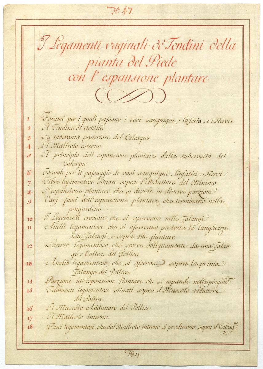 Der Text ist die ergänzende Beschreibung in italienischer Sprache zum anatomischen Wachsmodell des Fußes.