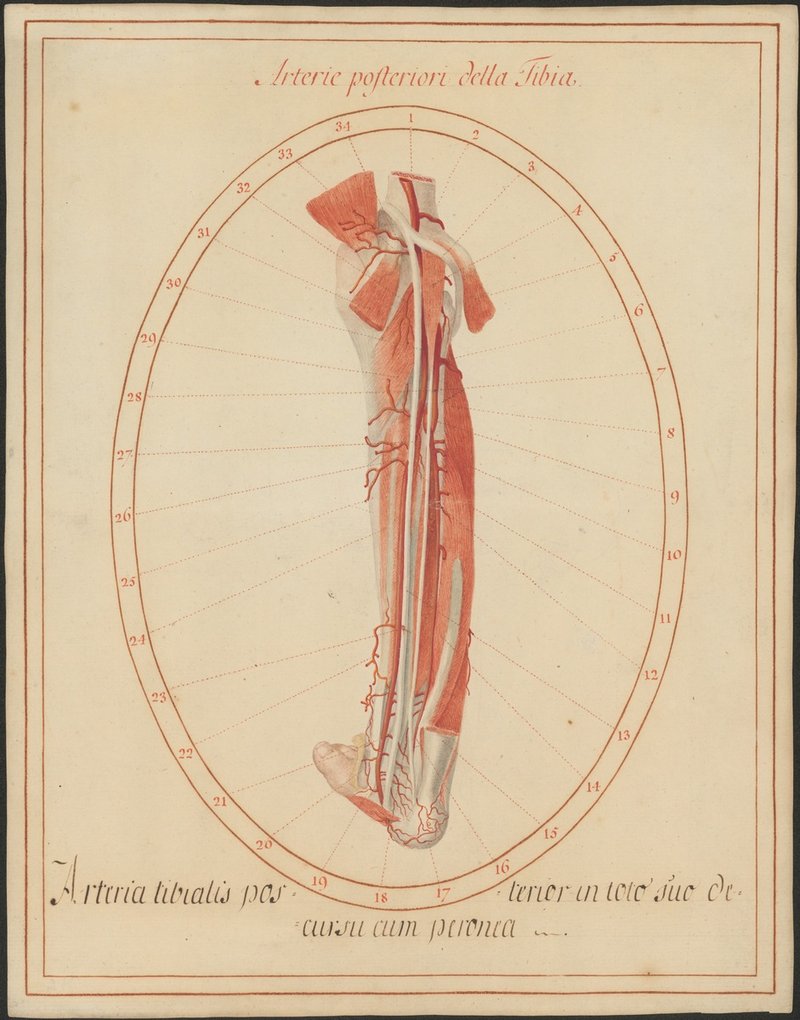 Die Teilung des Nervus ischiadicus in den Nervus tibialis und den Nervus peroneus / fibularis communis und die Arterien der Hinterseite des Unterschenkels (Arteria tibialis posterior und Arteria peronaea [fibularis]) des rechten Beines, die Muskeln der oberflächlichen Beugergruppe (Musculus gastrocnemius und Musculus soleus) sind entfernt.
