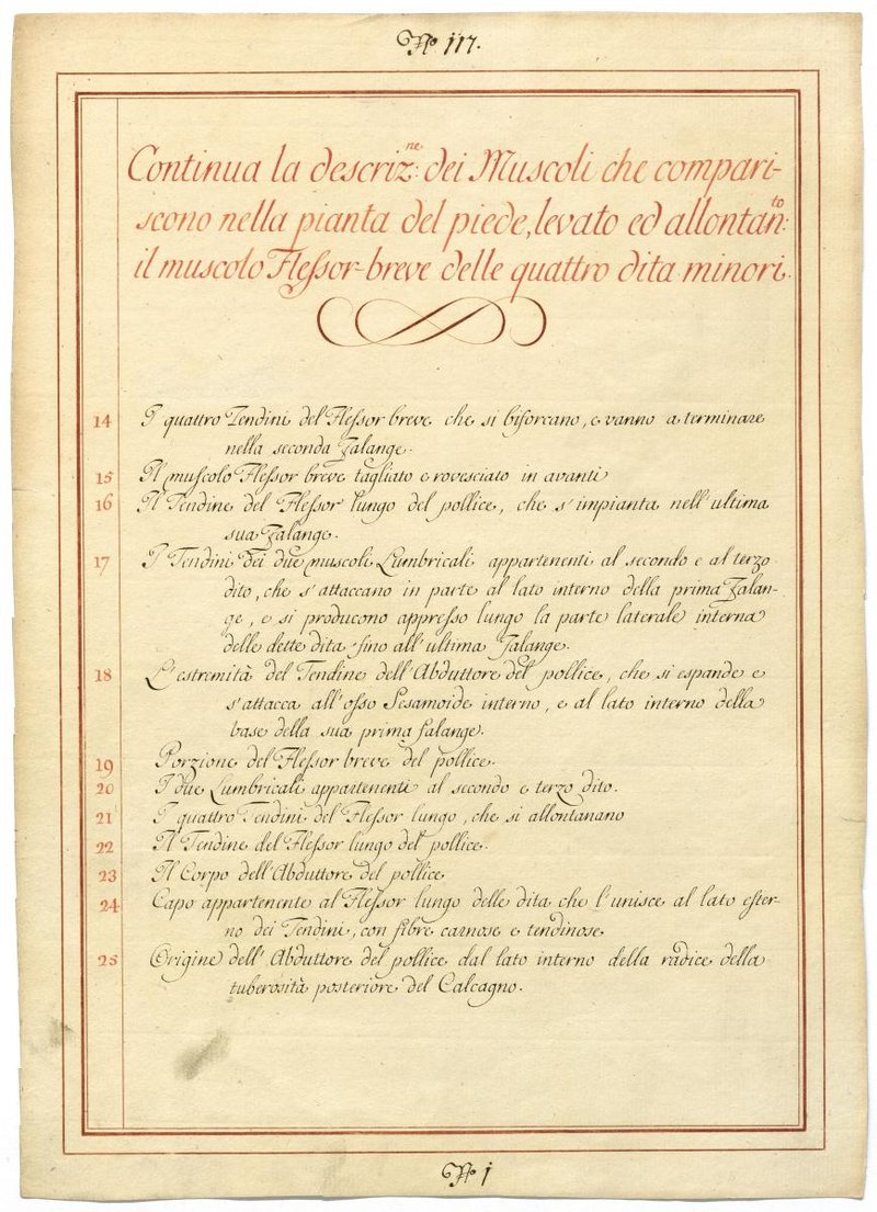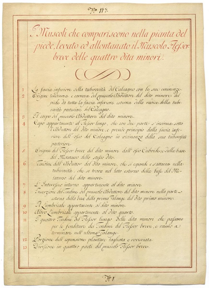 Der Text ist die ergänzende Beschreibung in italienischer Sprache zum anatomischen Wachsmodell der Muskeln der Fußsohle.