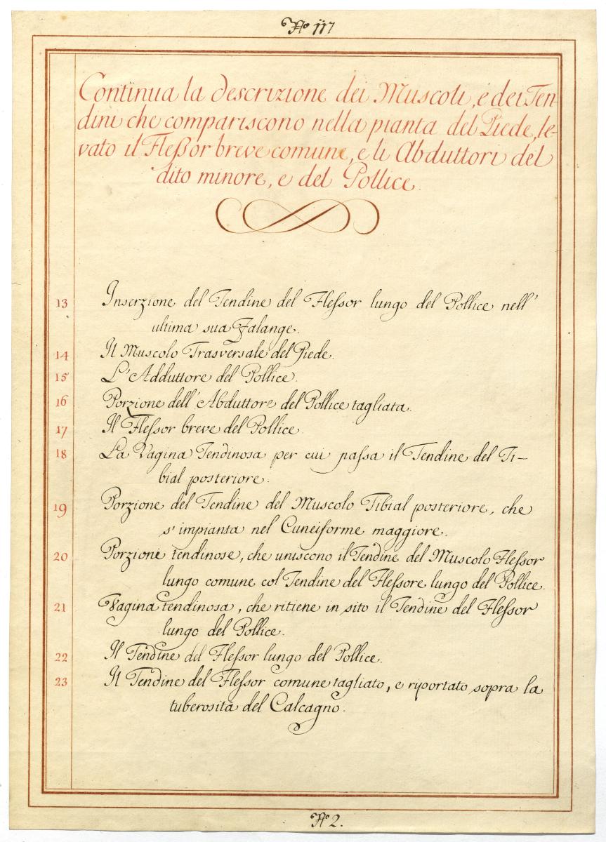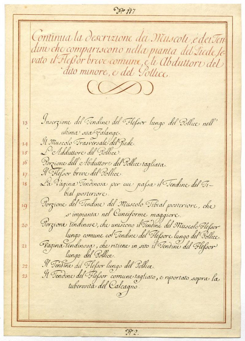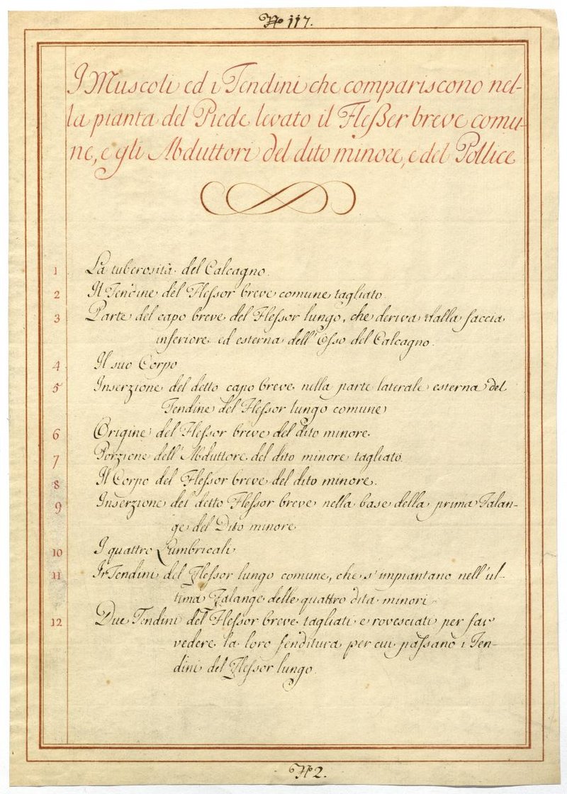 Der Text ist die ergänzende Beschreibung in italienischer Sprache zum anatomischen Wachsmodell der Muskeln der Fußsohle.