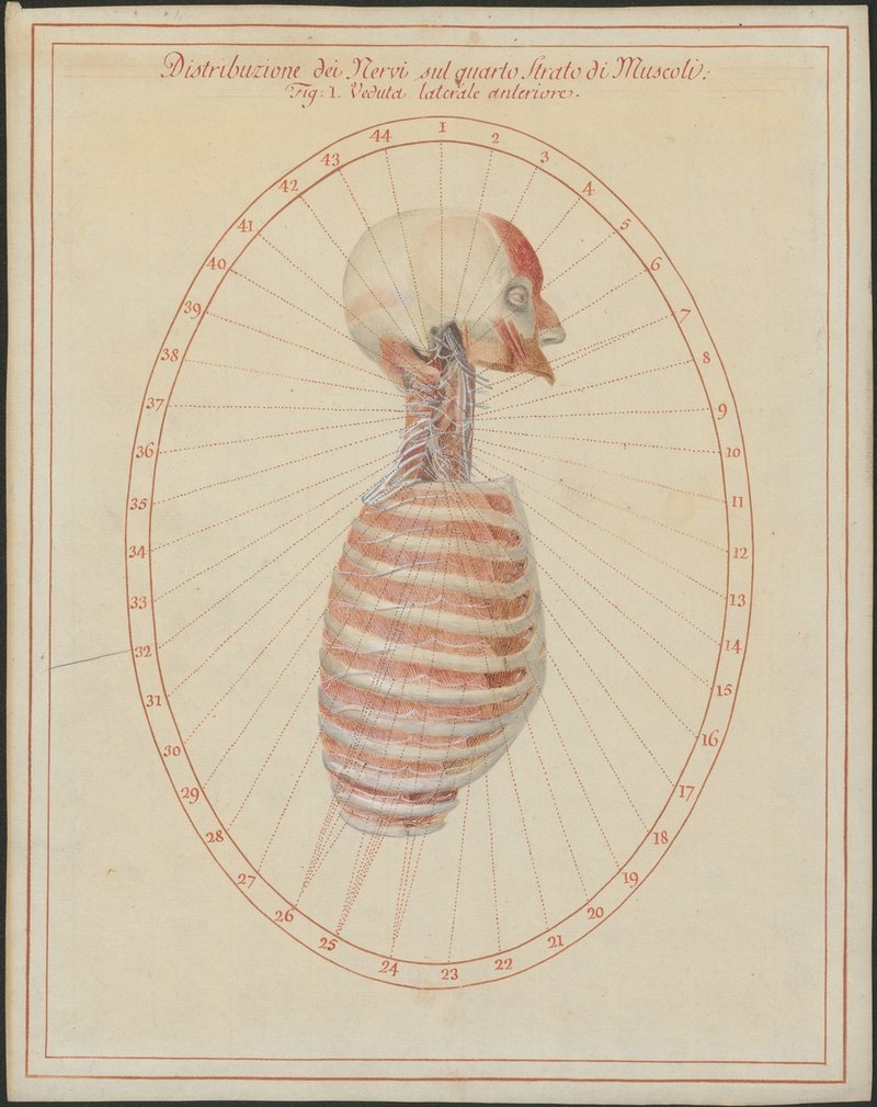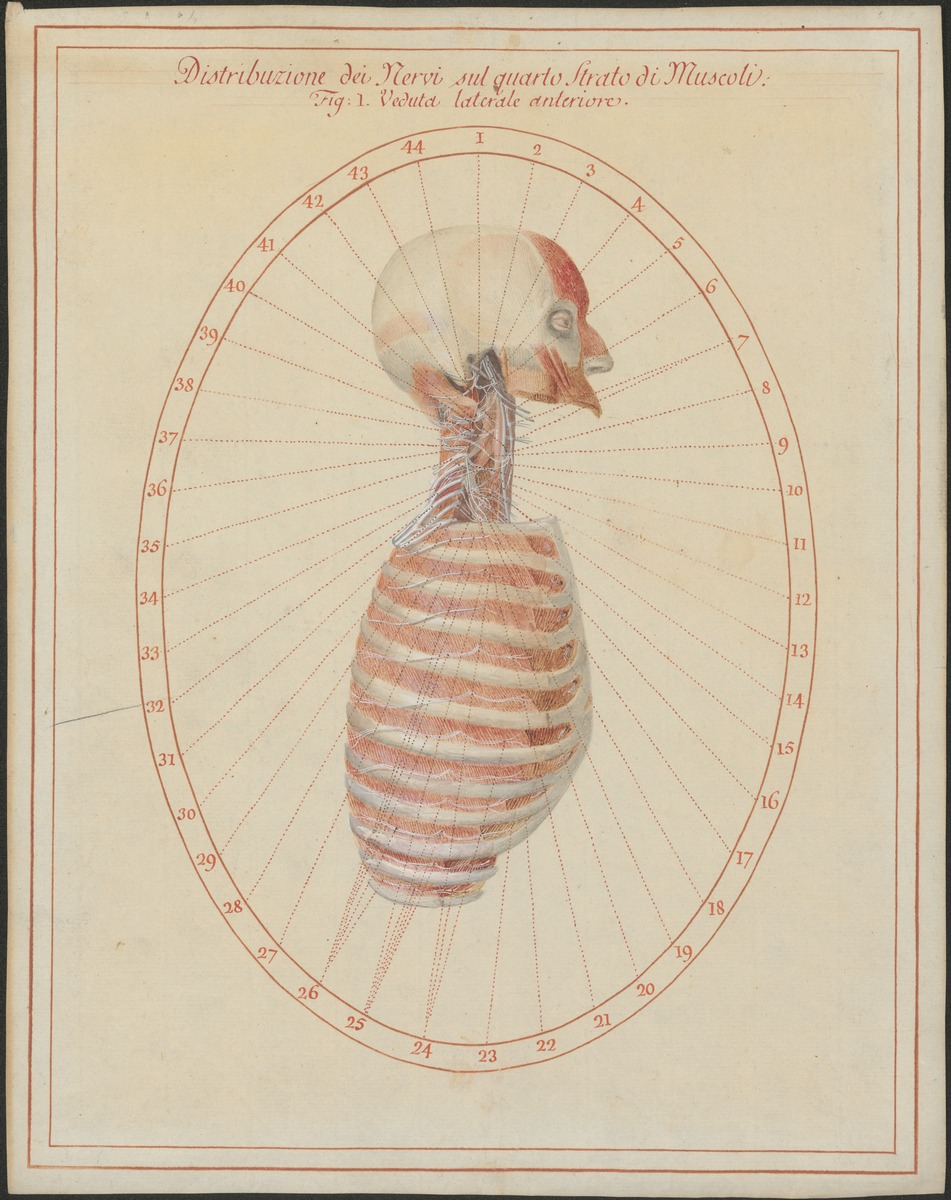 Kopf-Hals-Thoraxbereich der rechten Seite, die segmentalen Nerven sind dargestellt. Im Hals sieht man deutlich die Plexusbildungen des Plexus cervicalis und des Plexus brachialis.