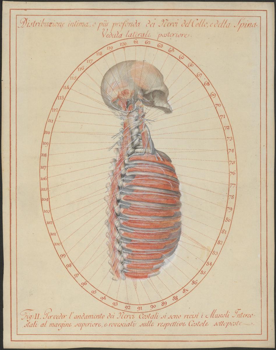 Kopf-Hals-Thoraxbereich der rechten Seite, die segmentalen Nerven sind dargestellt. Im Hals sieht man deutlich die Plexusbildungen des Plexus cervicalis und des Plexus brachialis. Im Bereich der Rippen ist der äußere Zwischenrippenmuskel (Musculus intercostalis externus) hinuntergeklappt, so sieht man die Zwischenrippennerven (Nervi intercostales), die am Unterrand der Rippen verlaufen.