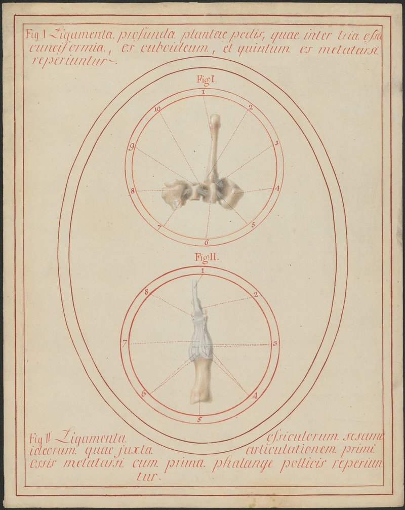 Fig. 1: 18/4: Isolierte Modelle der drei Keilbeine (Ossa cuneiforma), des Würfelbeines (Os cuboideum) und des zweiten Metatarsalknochens (Os metatarsale II) eines rechten Fußes, Ansicht von plantar. Detailpräparat der tiefen plantaren Bänder: zwischen den Berührungsflächen der Keilbeine verbindenden Bänder (Ligamenta intercuneiformia interossea) und zwischen den Berührungsflächen des lateralen Keilbeins und dem Würfelbein (Ligamentum cuneocuboideum interosseum). Fig. 2: 18/6: Isoliertes Modell des ersten Zehenstrahls. Die Position der Sesambeine (Ossa sesamoidea) im Bereich des Großzehengrundgelenkes (Articulatio metatarsophalangea I.) und ihre Bänder sind klar ersichtlich.