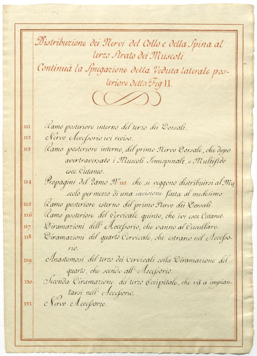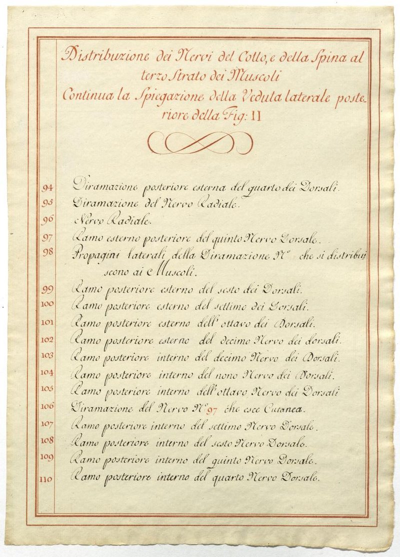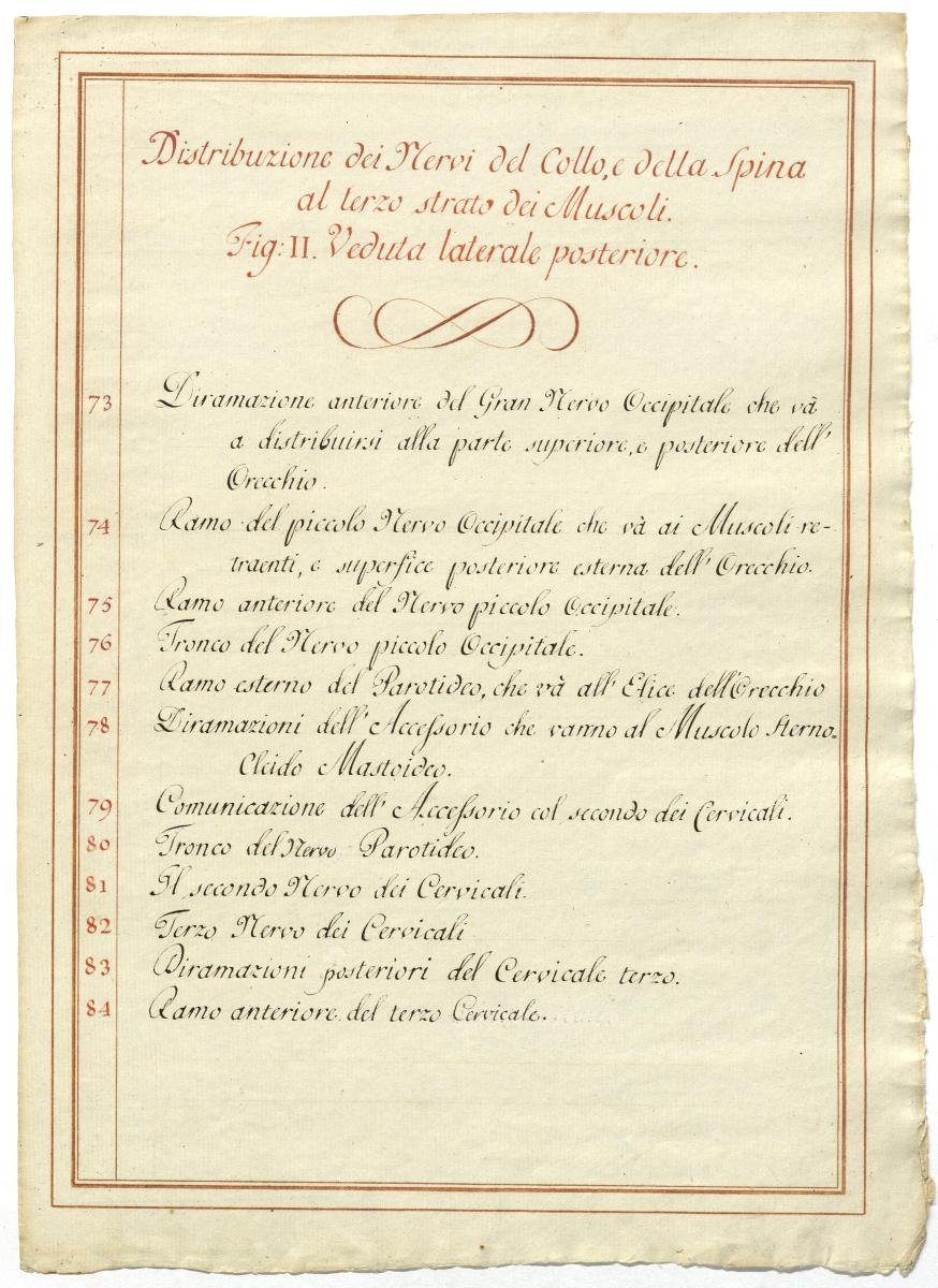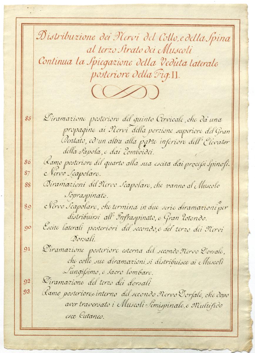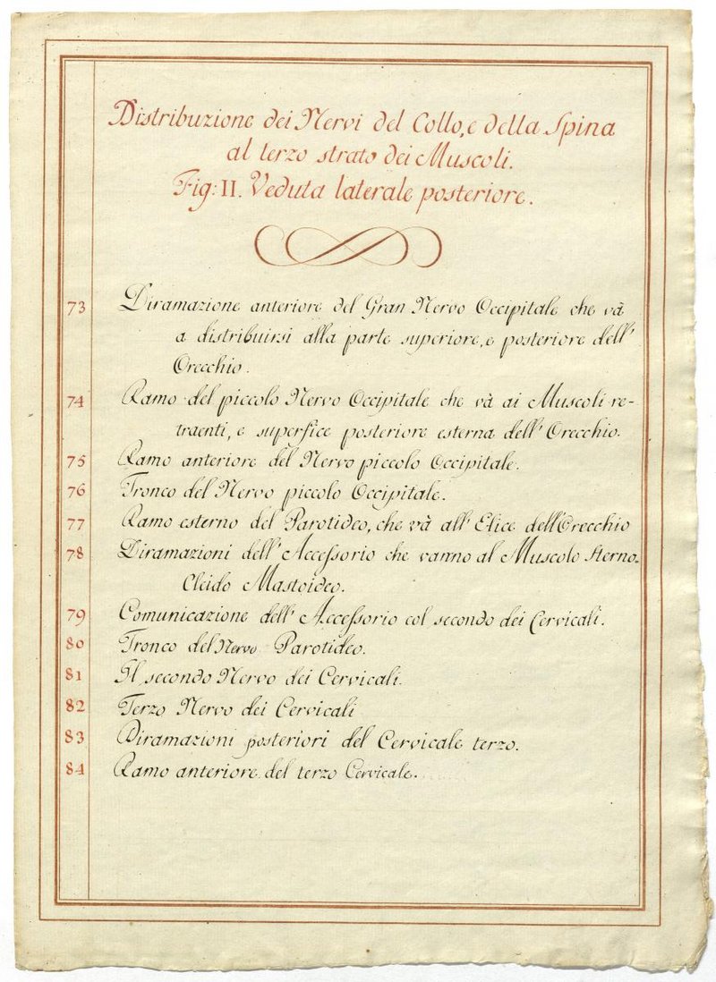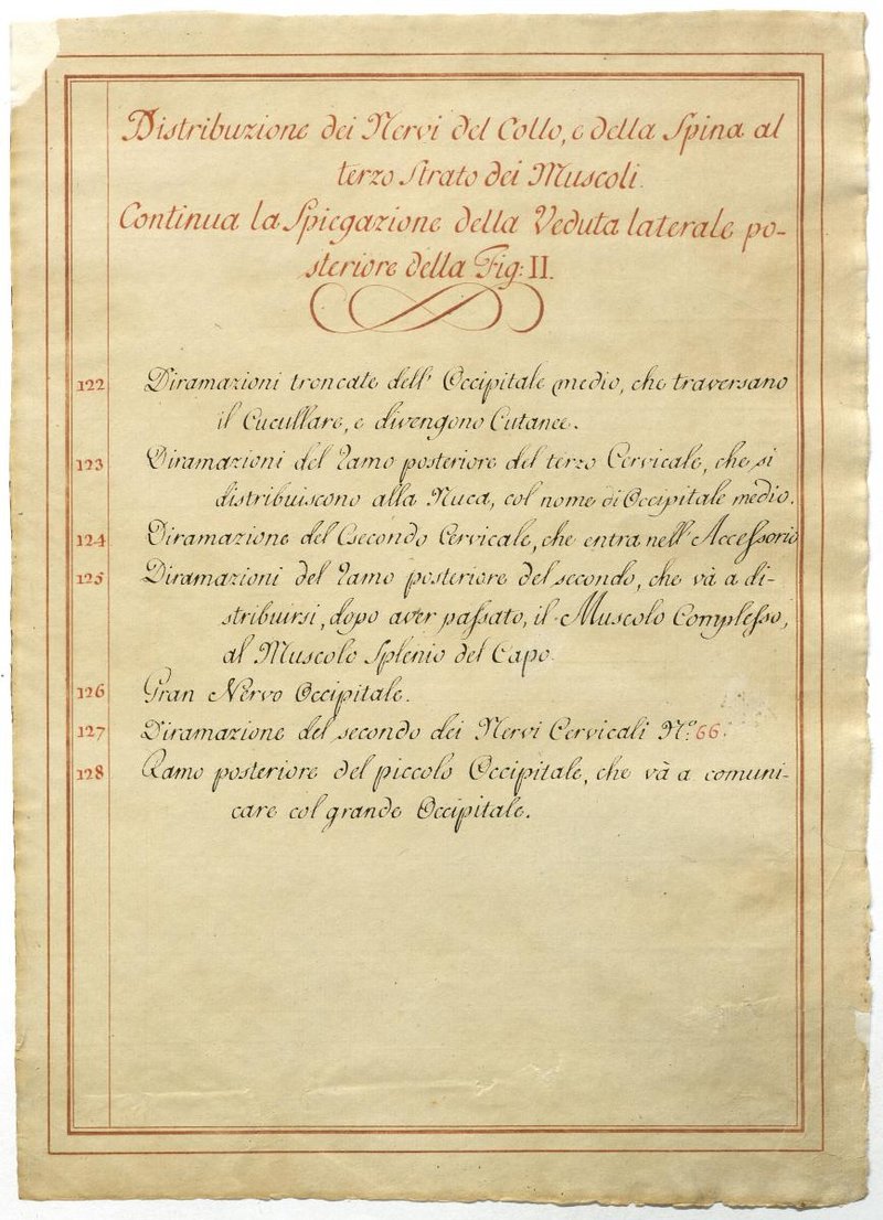 Der Text ist die ergänzende Beschreibung in italienischer Sprache zum anatomischen Wachsmodell des Plexus cervicalis und Plexus brachialis.