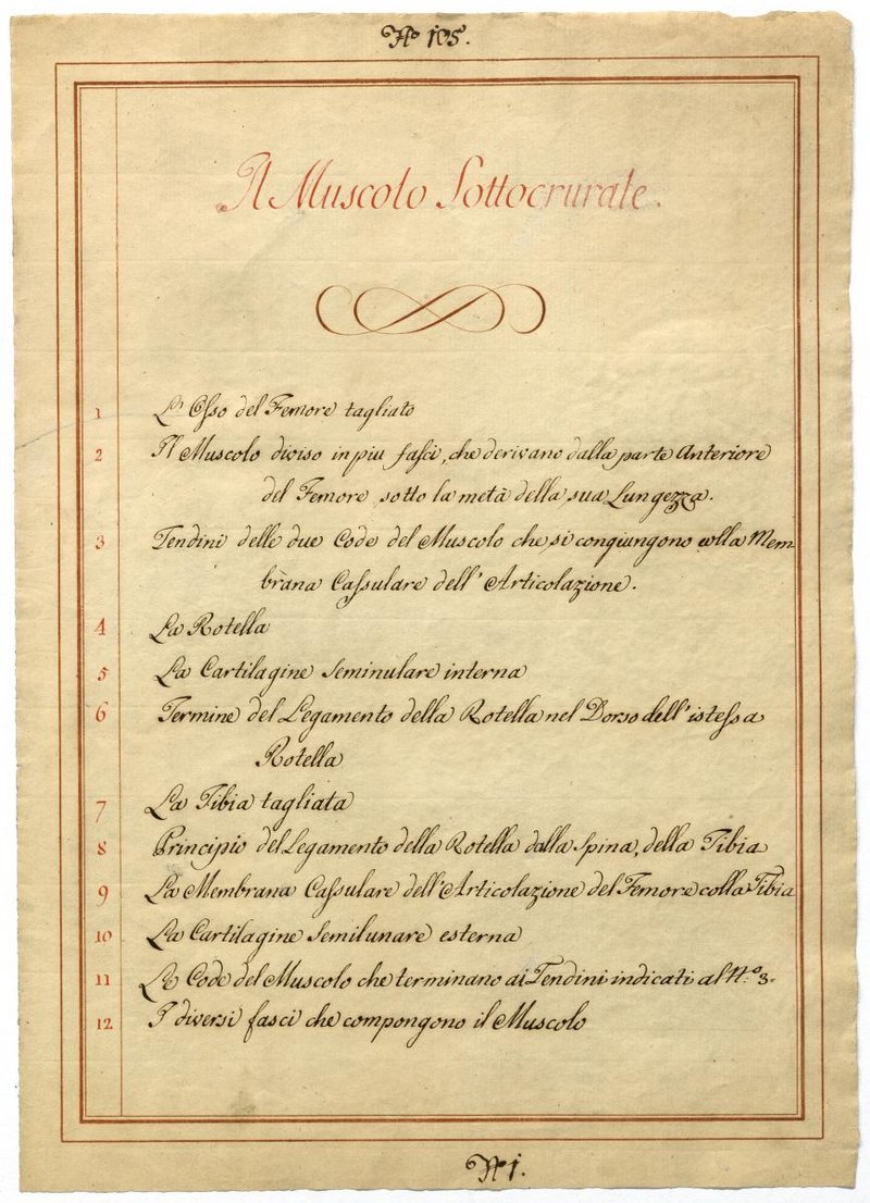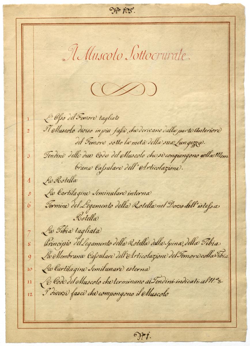 Der Text ist die ergänzende Beschreibung in italienischer Sprache zum anatomischen Wachsmodell des Oberschenkels.