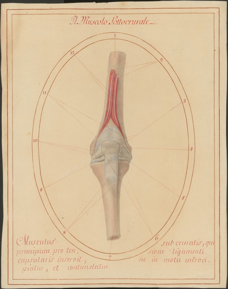 Knochen des rechten Kniegelenks. Die tiefen Teile des Musculus quadriceps femoris, die als Kapselspanner (Musculus articularis genu) funktionieren.