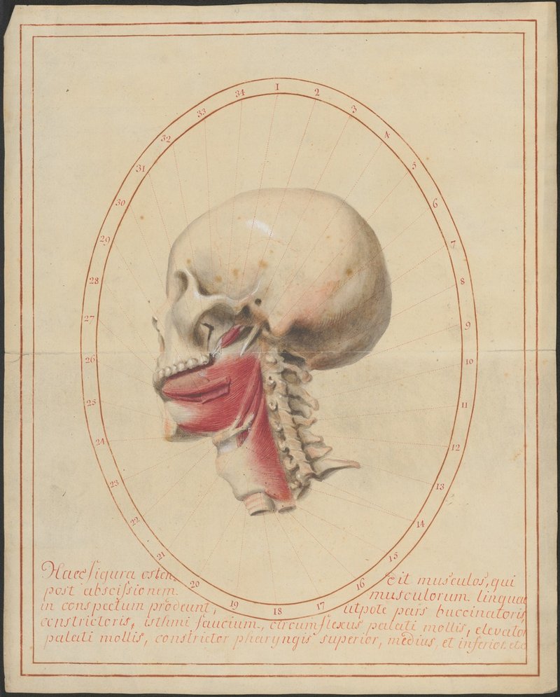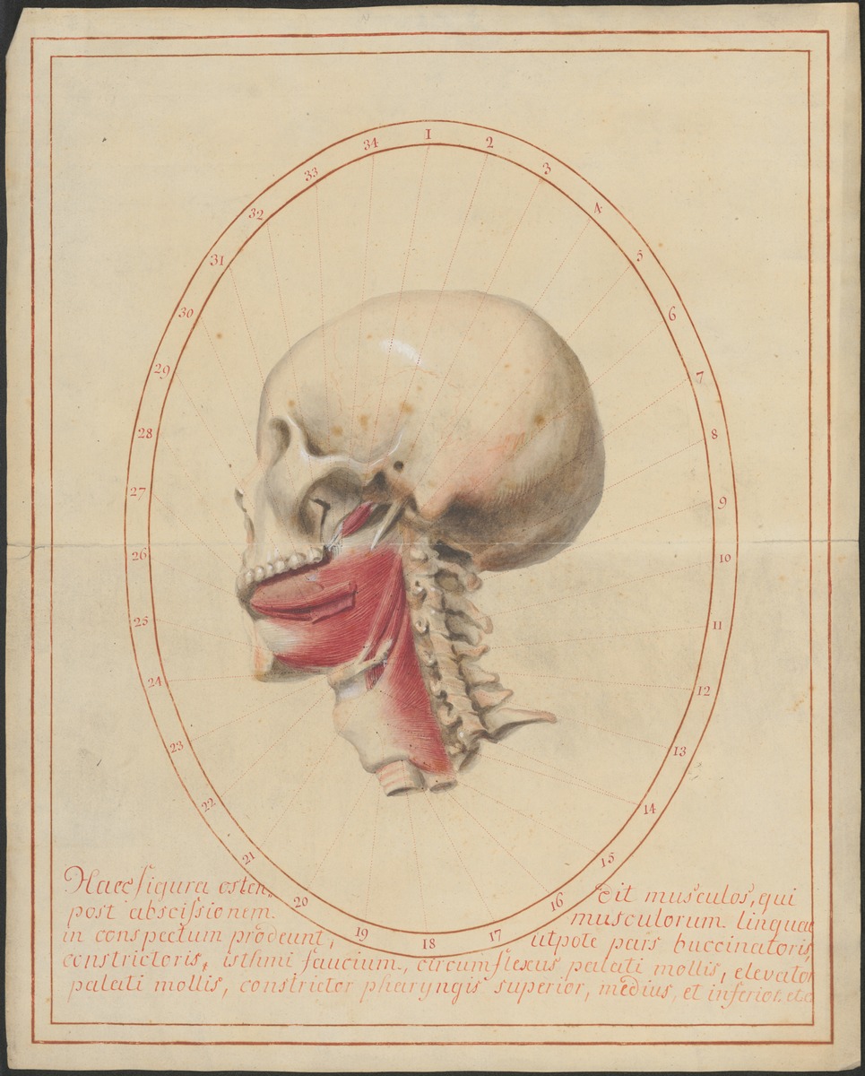 Seitliche Ansicht des knöchernen Kopf-Halsbereiches. Insbesondere die, die Halseingeweide (sichtbar sind Kehlkopf mit beginnender Luftröhre und Rachen mit beginnender Speiseröhre) umschließenden Muskeln der Gruppe der Ober- und Unterzungenbeinmuskeln sind dargestellt, die linke Mandibulahälfte wurde entfernt. Der Musculus styloglossus wurde durchtrennt, man sieht Musculus levator veli palatini und Musculus tensor veli palatini des Gaumensegels, die unteren beiden Etagen der Schlundschnürer (Musculus constrictor pharyngis medius und Musculus constrictor pharyngis inferior), Musculus genioglossus, Musculus stylopharyngeus, Musculus geniohyoideus, Musculus longitudinalis inferior der Zunge und den Musculus buccinator.