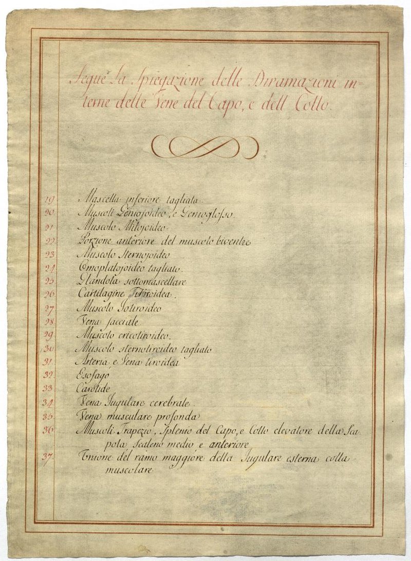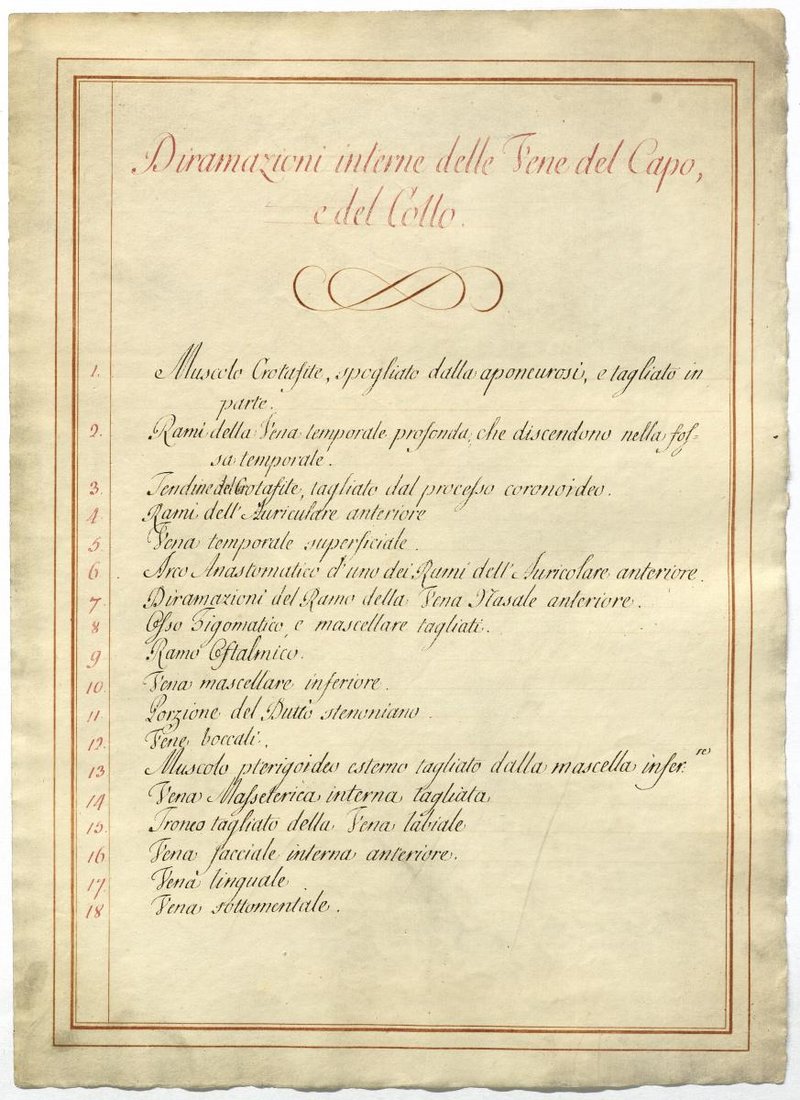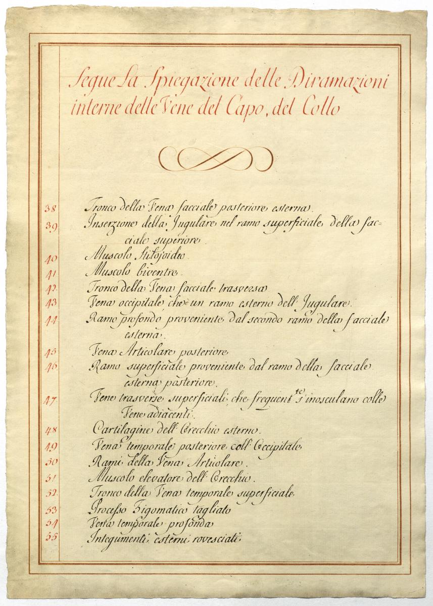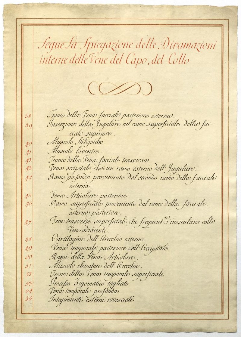 Der Text ist die ergänzende Beschreibung in italienischer Sprache zum anatomischen Wachsmodell den Kopf-Hals-Venen.