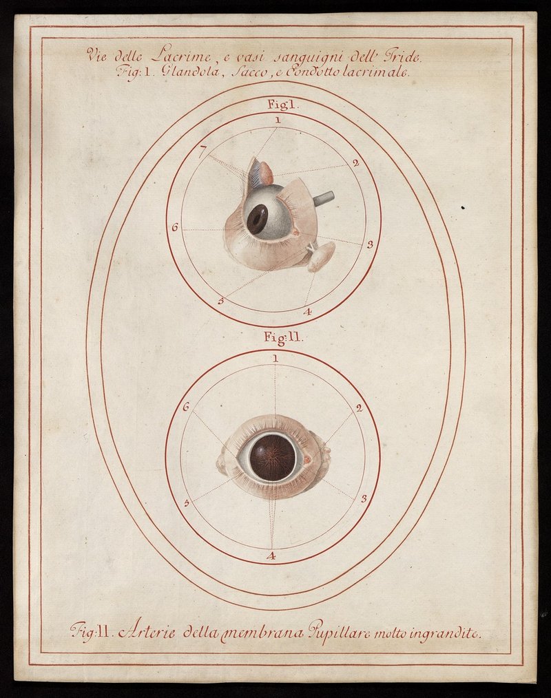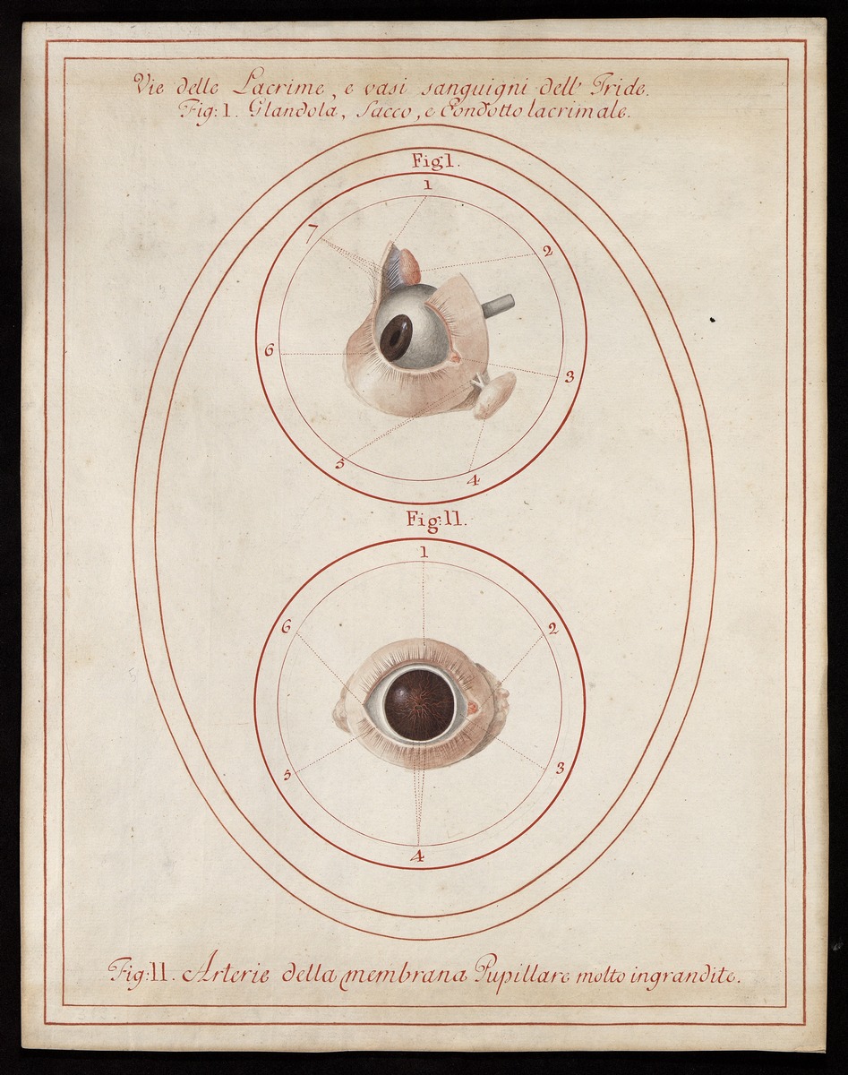 Fig. 1: 320/3: Die Tränendrüse (Glandula lacrimalis) mit ihren Ausführungsgängen (Ductuli excretorii), den Tränenröhrchen (Ductuli lacrimales) und dem Tränensack (Saccus lacrimalis). Fig. 2: 320/5: Die Arterien der Pupillarmembran (Membrana pupillaris), vergrößert dargestellt.