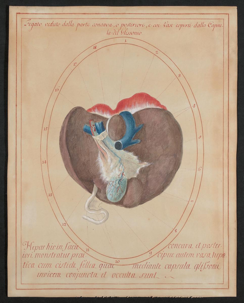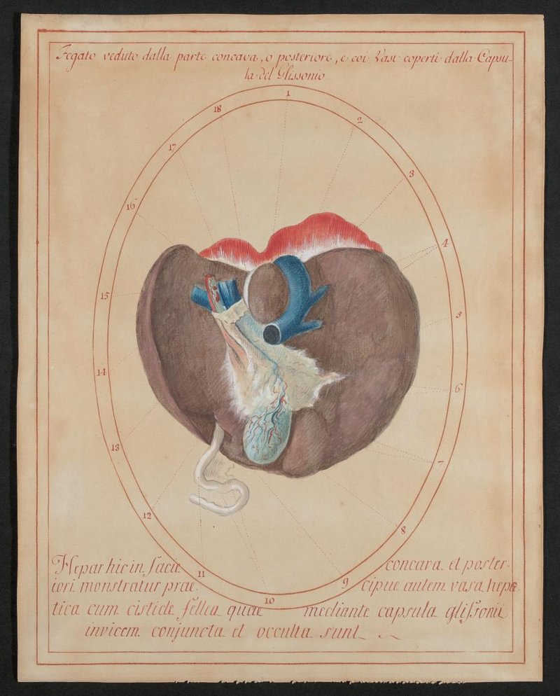 Unteransicht der Leber. An der Modelloberseite sieht man noch Reste des Zwerchfelles (Diaphragma) und direkt anschließend die untere Hohlvene. Der Hohlvene anliegend befindet sich an der linken Seite der Lobus caudatus der Leber. Direkt davor liegt die Gallenblase und an ihrer Seite links anliegend der Lobus quadratus der Leber. Ebenfalls dargestellt sind die Gefäße der Leberpforte – Vena portae hepatis, Arteria hepatica propria und Hauptgallengang (Ductus choledochus). Am freien Rand der Leber befindet sich das Ligamentum teres hepatis. Der nach der Geburt verödende, zwischen der Pfortader und der unteren Hohlvene verlaufende Abschnitt der Nabelvene (Ligamentum venosum [Arantii]) ist ebenfalls angedeutet.