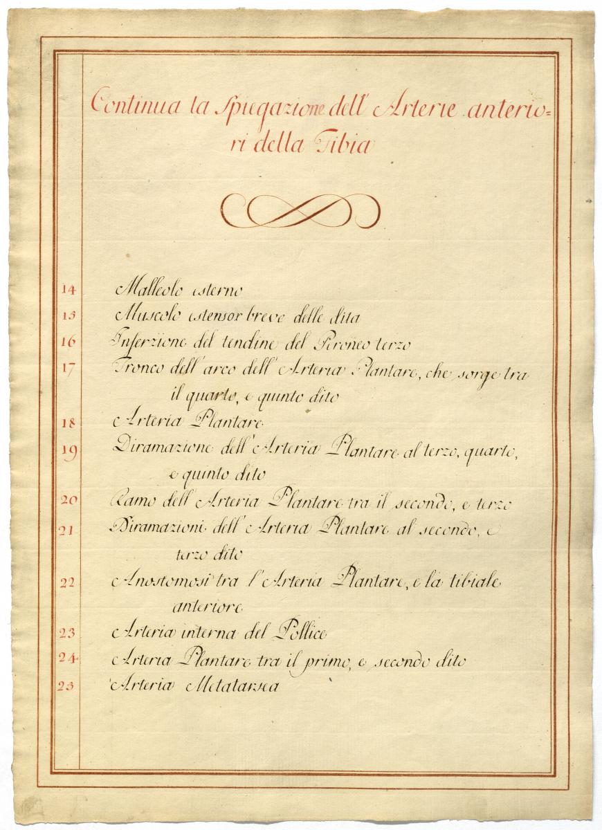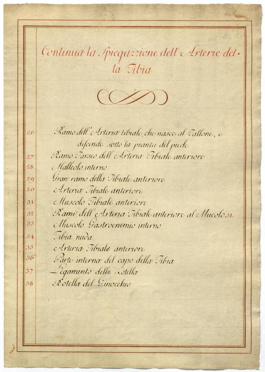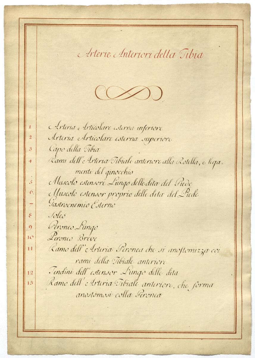 Der Text ist die ergänzende Beschreibung in italienischer Sprache zum anatomischen Wachsmodell der Unterschenkelarterie.